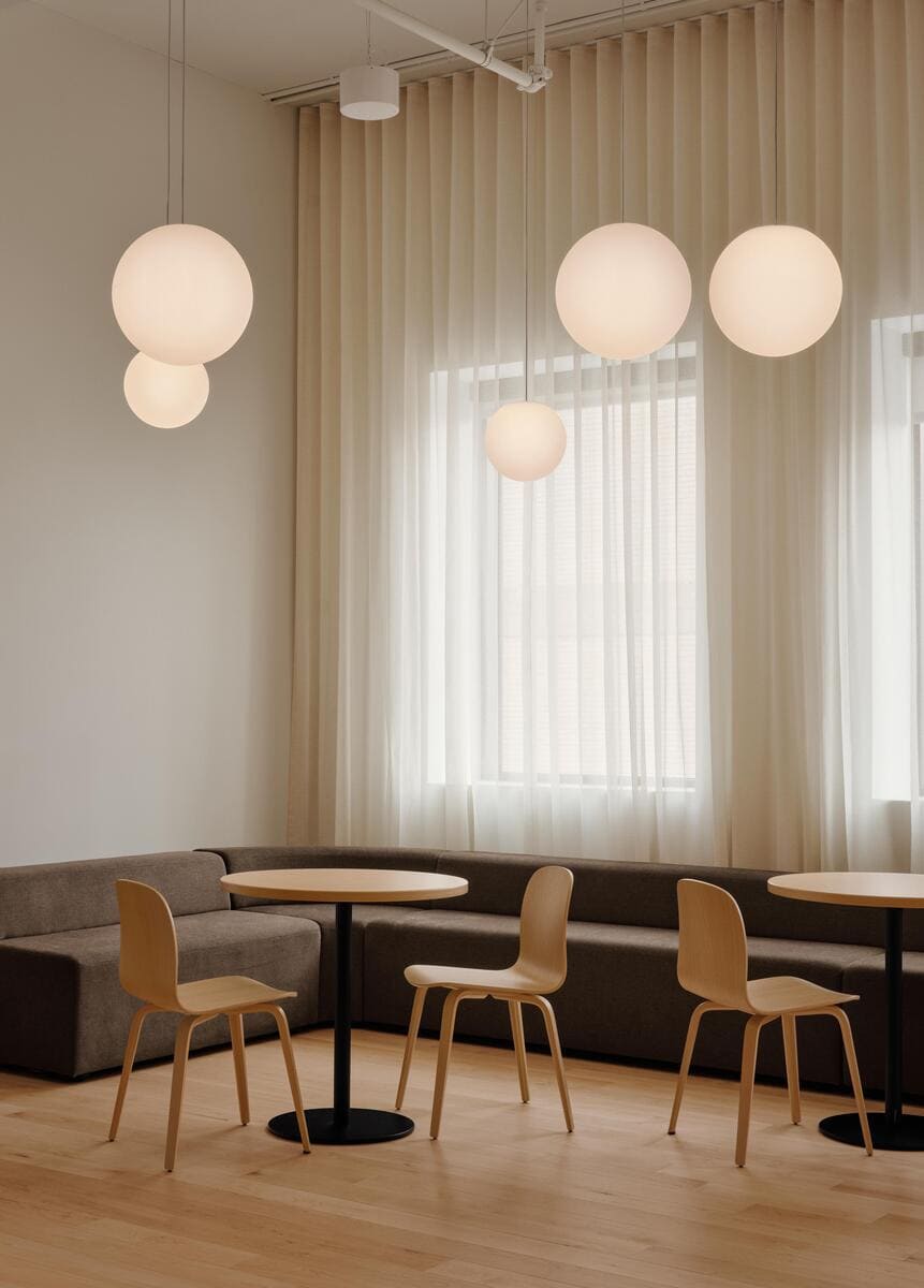 来訪者を迎えるレセプションとカフェは、都市の喧騒に対する穏やかな対比として機能する。建物本来の構造を参照する建築的要素に、フェルト素材や間接照明、白く塗装された打ち放しコンクリートが組み合わされ、洗練されつつも親しみやすい雰囲気が醸しだされている。街を望むカフェとラウンジは自然と人が集う場となり、誠実さや信頼、開放性といった同事務所の価値観を体現する空間となっている。