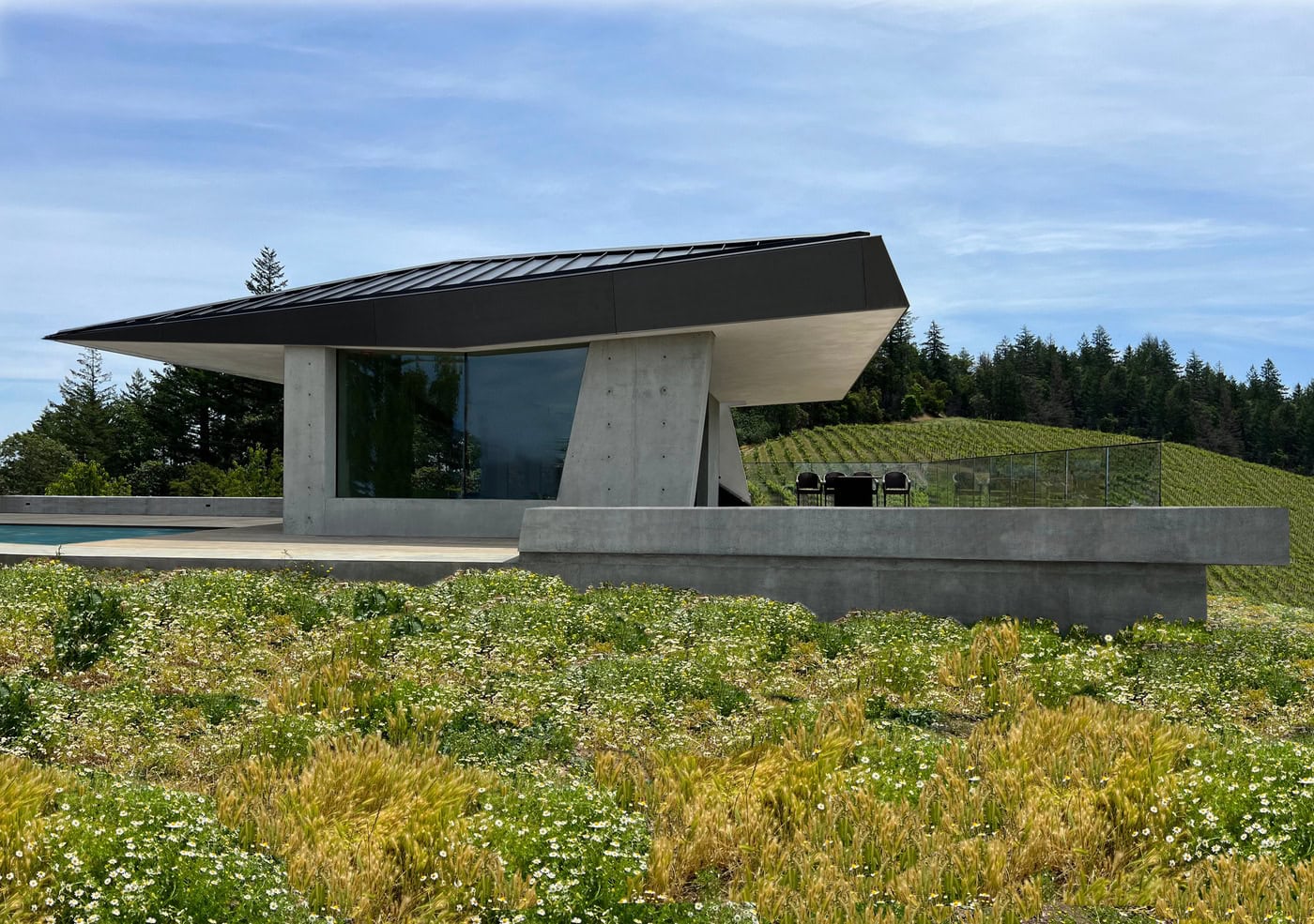 建物は現場打ちコンクリートによって形づくられ、四隅のマッシブなボリュームが広がりのある開放的な空間を生み出している。この構成により、周囲のブドウ畑との視覚的なつながりが強調され、空間全体に透明感がもたらされている。深い庇はプールデッキやテイスティングテラスに十分な日陰をつくり、屋内外の境界をあいまいにする心地よい中間領域を生み出している。