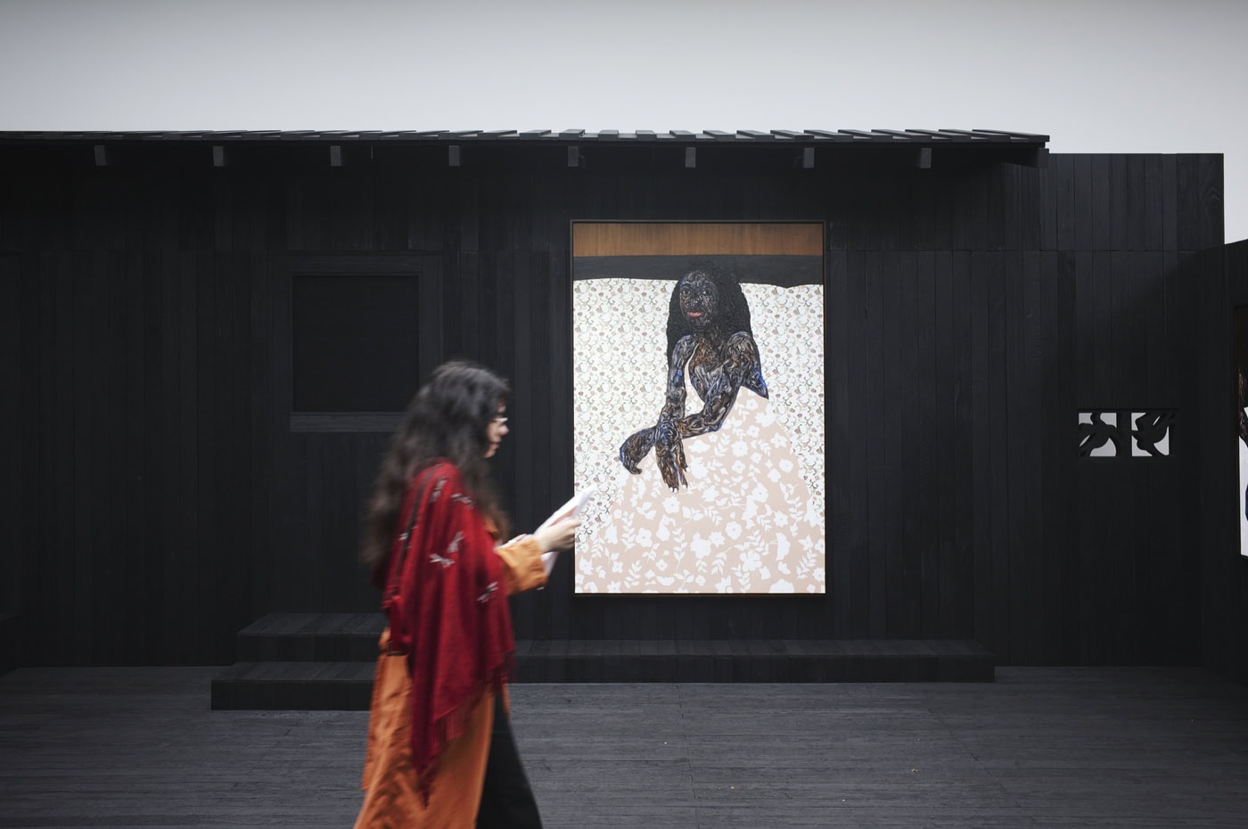 DeRocheは本展を「翻訳」として捉え、Boafoの作品に通底する社会的背景や共同体性を空間へと置換。ギャラリー1には《Courtyard Pavilion》、ギャラリー2には《Nkyinkyim》という二つの建築的インスタレーションを構成し、建築を単なる背景でなく、肖像画のテーマである「強さ・回復力・連帯」を空間的に拡張させるメディアとして扱っている。
