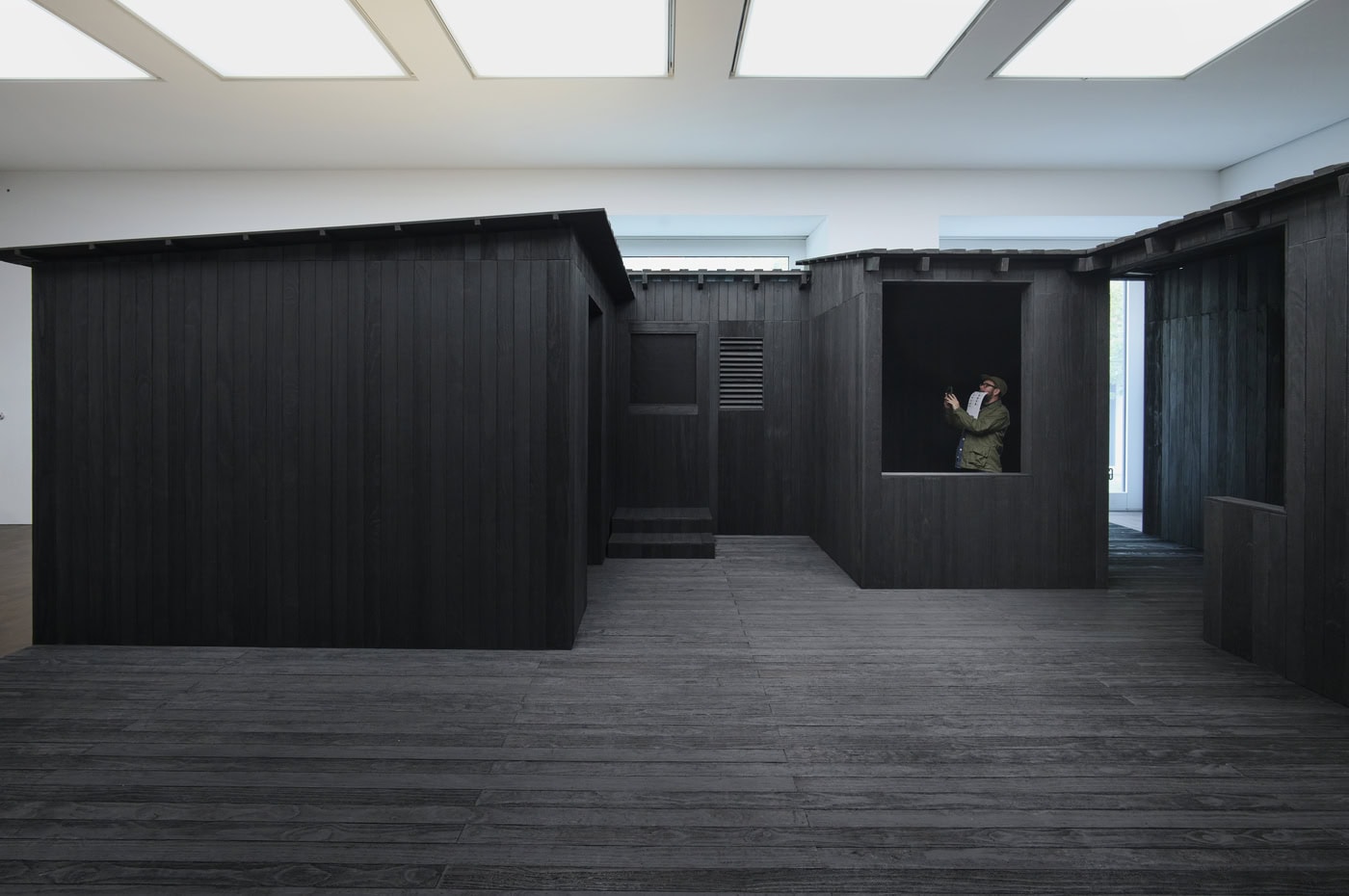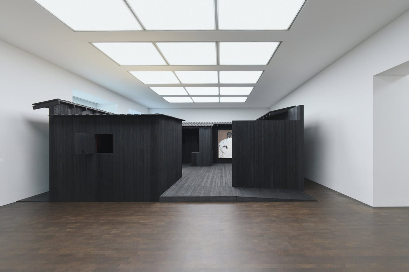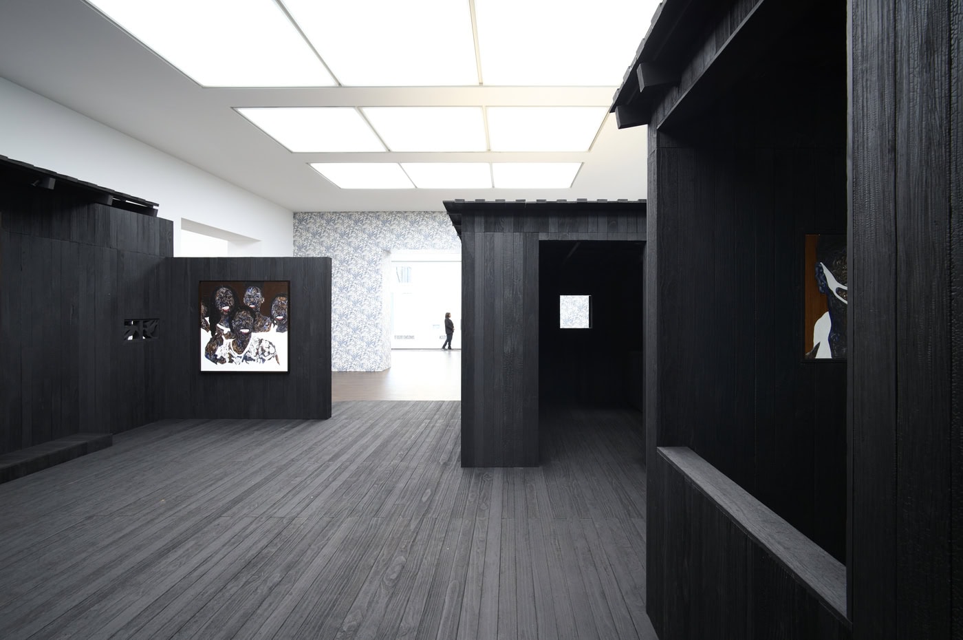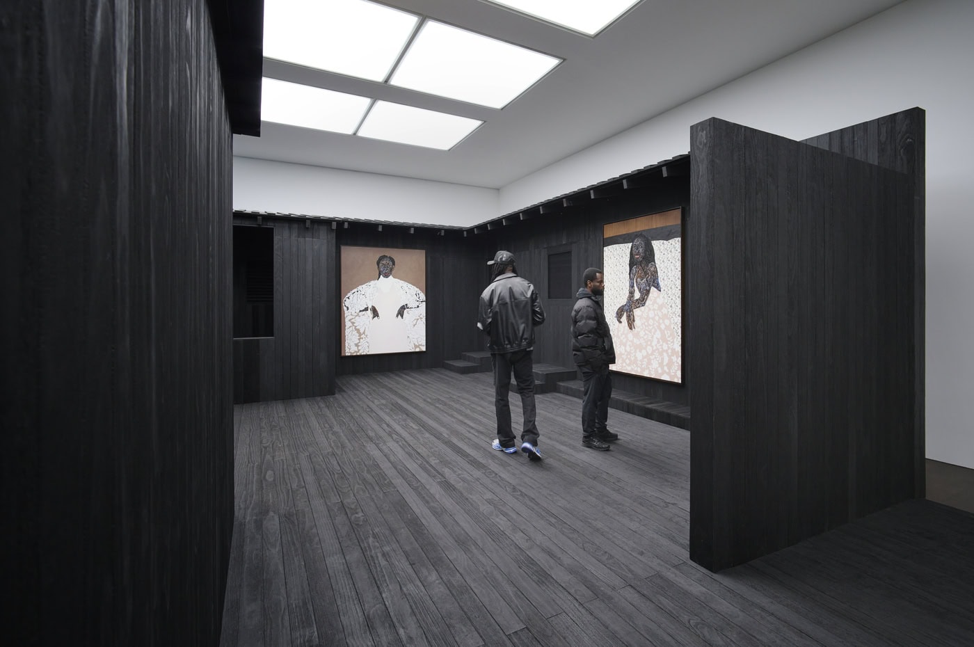 ギャラリー1では、Boafoの幼少期を過ごしたアクラの中庭の記憶が抽象的に再構成されている。ガーナの住宅文化において、中庭は家族の交流・世代間のケア・祝祭の中心であり、Boafoにとっても仲間たちとの創造的なつながりの起点となった空間であった。再構成された《Courtyard Pavilion》は、黒く焼かれたAccoya材によって構成され、儀式性と素材の記憶を持つ空間として来場者を迎える。作品はこのフレーム内の壁龕(ニッチ)に配置され、「ギャラリー内のギャラリー」として静かな集中を促す。さらにGagosian Mayfairでは初めて、ギャラリーの窓を全て開放。都市空間と展示空間がつながり、Boafoの作品が体現する公共性が建築を通じて広がる。