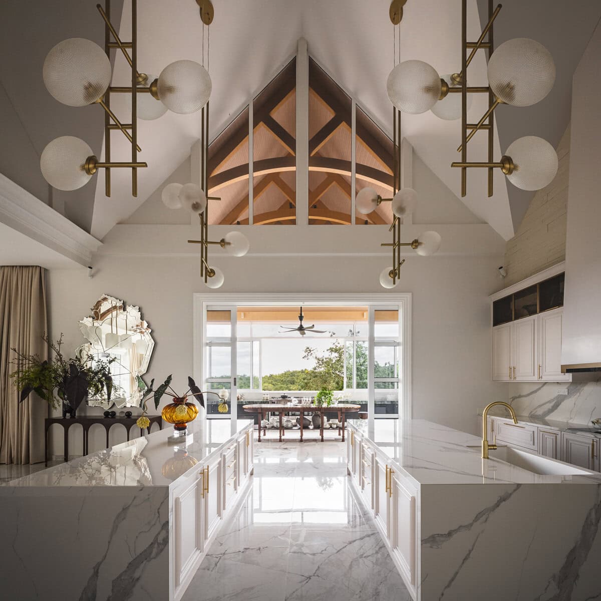 Here, nothing is meant to feel cohesive—the patterned floor, angled brass fireplace, and irregular timber ceiling each assert their own presence, all anchored by the bronze crystal chandeliers. The ceiling, shaped directly by the roof's awkward geometry, is left unapologetically raw to heighten visual tension and drama.
