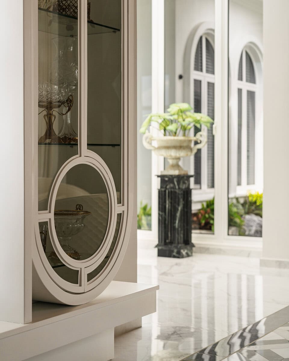The feature cabinet details echo the curvature of the windows through a play of circles, while its design