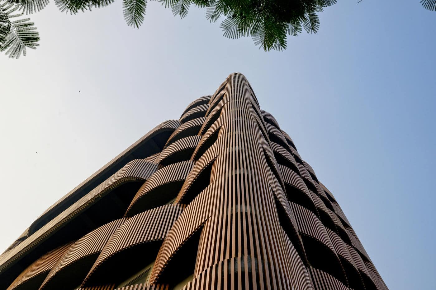 ナグプールはインドでも特に高温となる都市で、夏季には気温が48度に達する。本計画では、この厳しい気候条件に応答するため、外装を多層的な気候応答型ファサードとして構想した。半円形のオープンデッキとプランターをアルミニウム製ルーバーで包み、建物外周に水平・垂直方向に交互配置することで、直射日光による熱取得を抑制している。あわせて緑化を取り入れ、内部空間に日陰と冷却効果をもたらす環境を生み出している点も特徴。