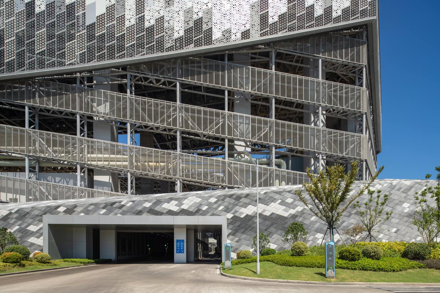 Visitor drop-off area at the Baoshan Waste-to-Energy Center, protected by a translucent ETFE canopy.