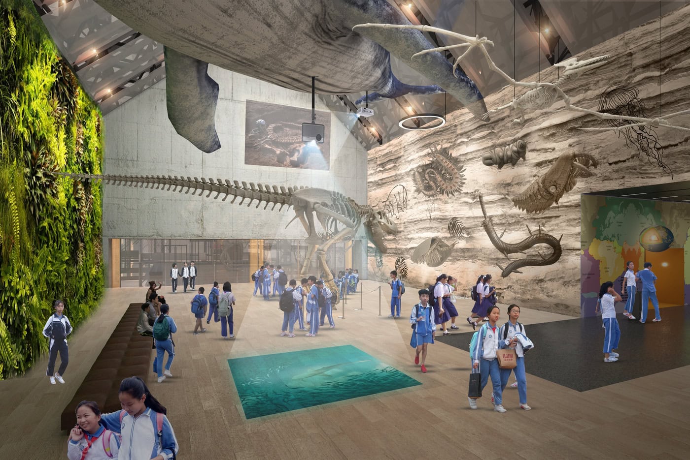 Rendering of the Museum of Waste’s Entrance Hall, where thematic displays on the origins of fossil fuels immerse visitors in the “Story of Trash.”