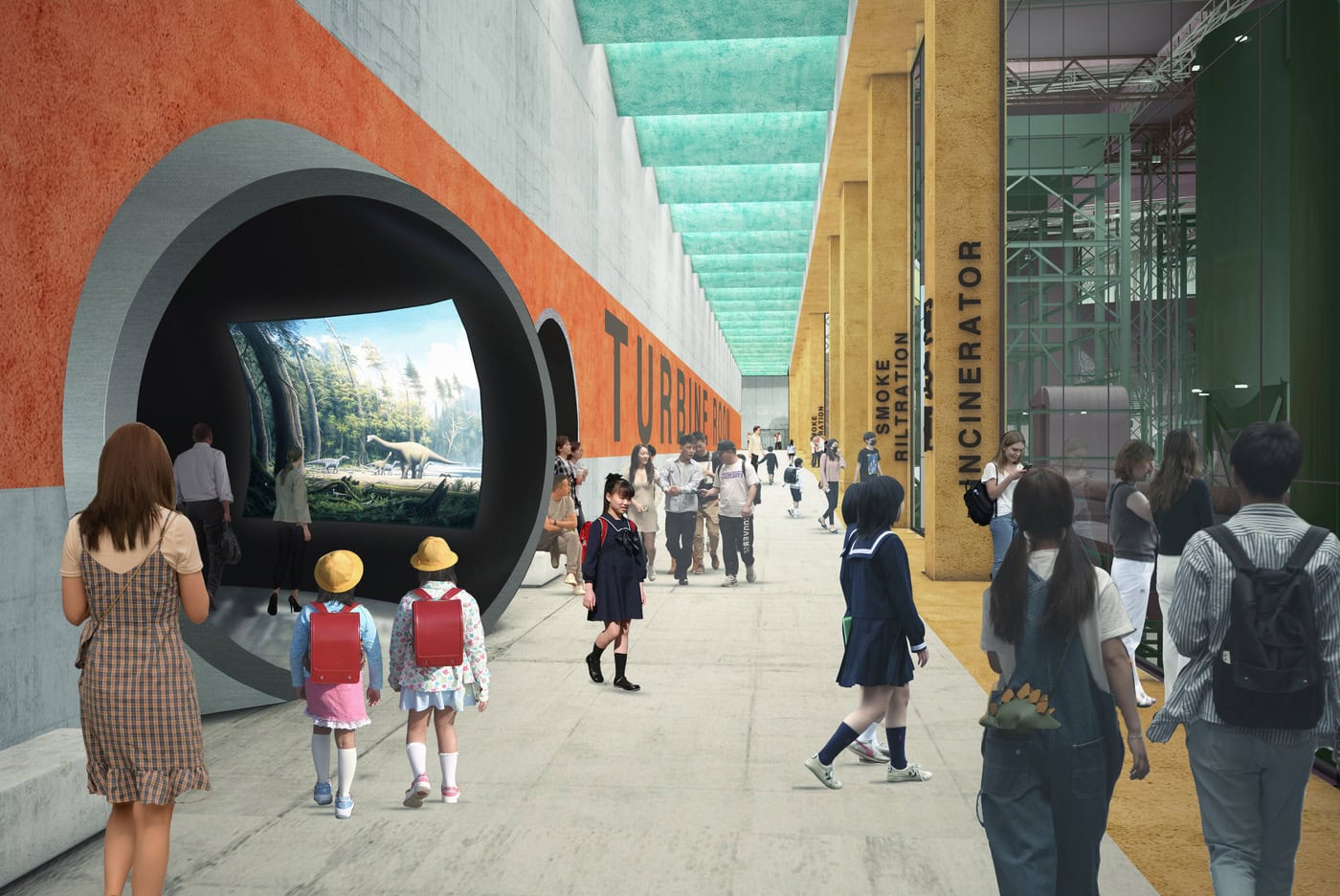 Rendering of the plant tour’s incineration and filtration zone, where visitors walk alongside operating turbines and observe emission control systems through glass partitions.