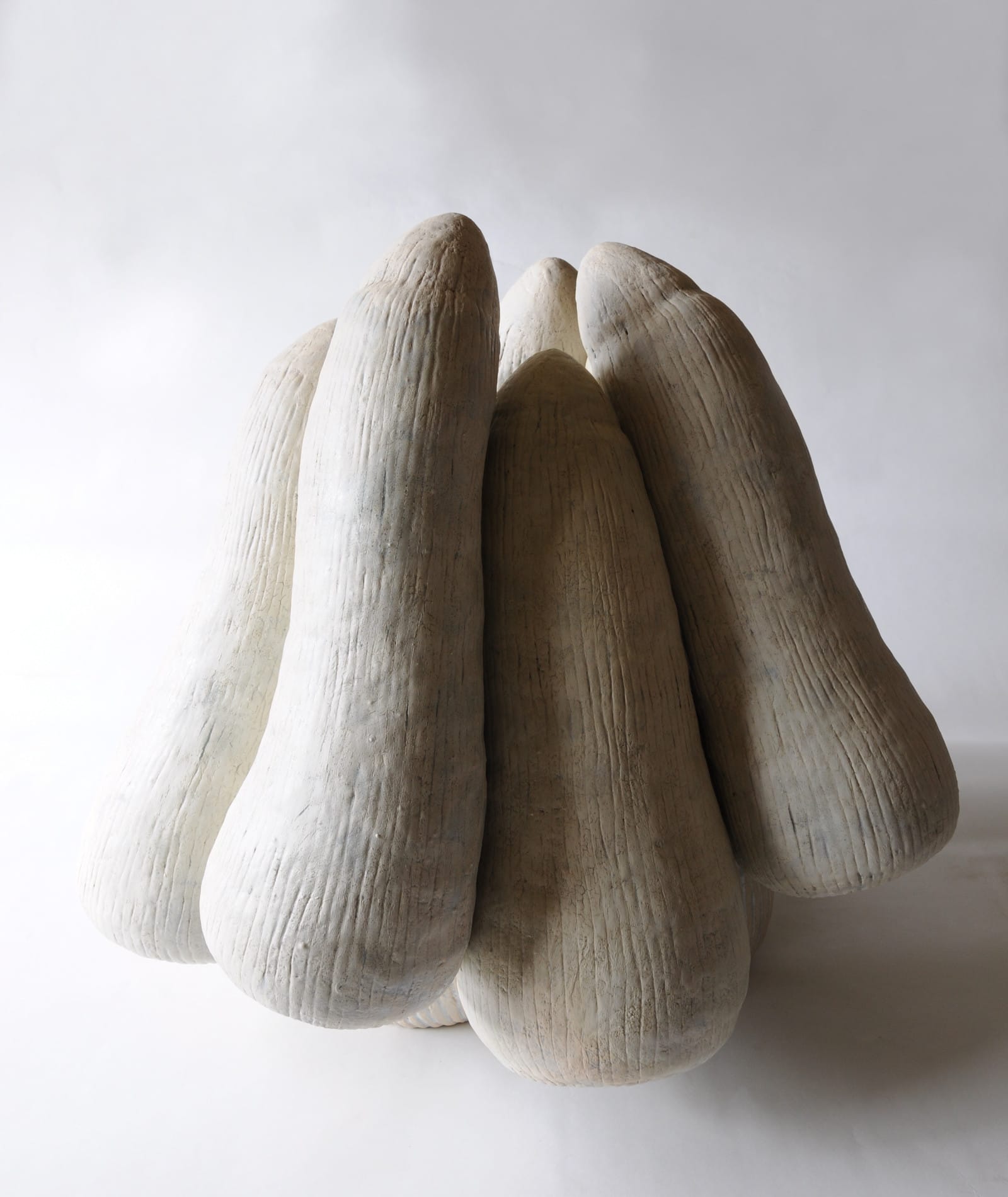 土をこね、焼きしめて生成される陶は、古来から器を中心に用いられてきた。その素材で制作した複数のパーツを組み合わせた大型作品を中心に発表してきた中井川。クヌギ林の庭にうごめく生き物たちの、美しくグロテスクな形の発見が作品を作る動機となると言う。少しずつ表情が異なるいくつかの形を並べ、積み重ねることで構成される作品は、まるで命を宿した生き物のような不思議な存在感に満ちている。