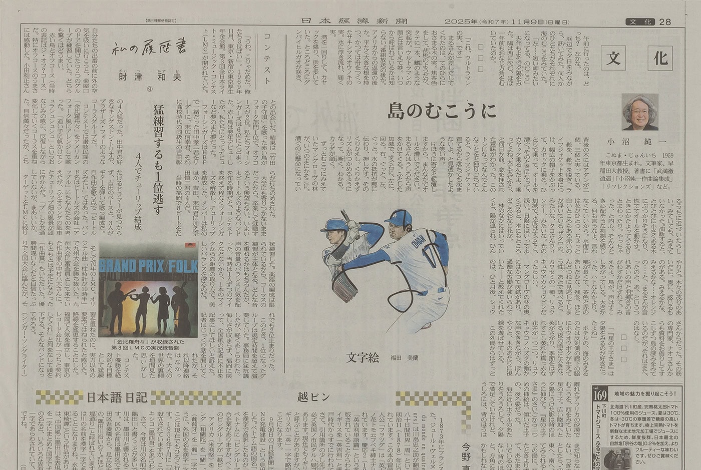 大谷翔平選手は、2025年11月に3年連続のMVPを受賞し、50本塁打&50奪三振という二刀流復活を象徴とするW記録も達成。この挿絵掲載の11月9日の時点でMVP受賞はほぼ確実と予想され、結果待ちの状態だったので、大谷の姿に「うつ」「なげる」の隠し文字を入れ、江戸時代から伝わる文字絵とした。北斎も文字と絵を融合させたユーモアあふれる遊び絵を制作していて、北斎にとって文字は形そのものが絵の骨格となる素材であり、文字を幾何学的パーツの集合体と捉えて読むものから見るものへと昇華させた点に新しさがあるように思う。技術的高さとユーモアが両立した江戸時代の粋を感じさせる魅力に、大谷への期待を重ねた。(福田美蘭)