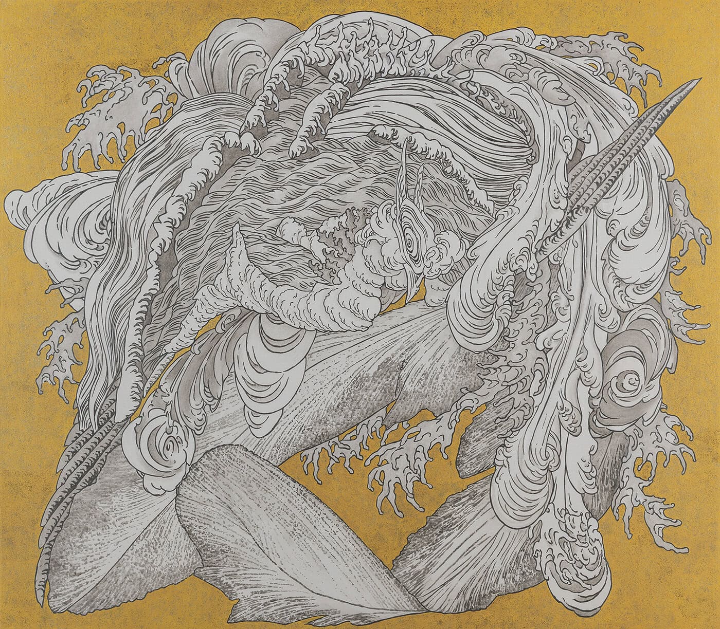 小布施上町の祭屋台の天井桐板に描かれた二図の渦巻を「近年「男浪」.「女浪」と俗称し、両図を「怒濤図」と呼んでいる」ことから、「怒濤」の意味の、激しい勢いのあるもの、勢いよく攻撃する様子を連想し、又「「怒濤図」の海底深く潜り込んでゆく渦巻には、波に宿る生命の根源に迫ろうとする北斎の執着が感じられる。」ということから二図を合体させて、女浪の中に男浪の波飛沫が潜り込んでゆくイメージをつくり、北斎の執着した生命の根源を具体的な形にしてみた。「制作当初どの向きで浪図が配置されていたのか判明しない…」ことも浪を再構成するプロセスを自由にしてくれて、北斎の波に手を加えることなくそのまま引用した。最初から図像の中に暗示されていたかたちから、近年の浪の俗称がついたと思われる。(福田美蘭)