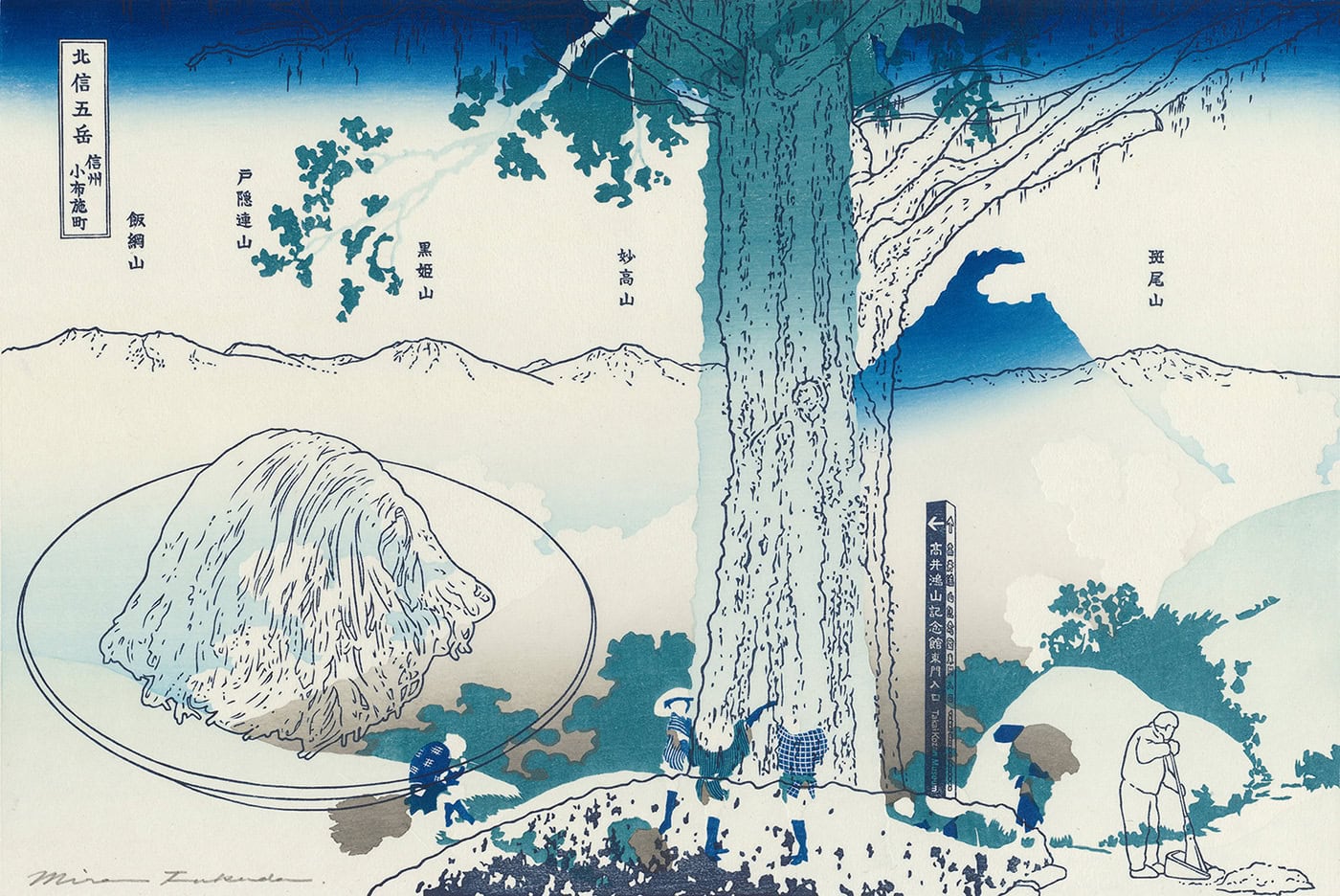 「冨嶽三十六景 甲州三嶌越」の背の高い巨木の存在感は、小布施町中心のシンボルツリーとして大きく枝を拡げ、来訪者を迎えるメタセコイアの印象と重なり、その後方にはこの町の高台から一望できる北信五岳の連なりを描く。富士山と同様に単独峰でありながら、五岳が揃って見える事は素晴らしいのだが、高さでは富士山に負けるので、それより高いモンブランの山として、秋の小布施堂の栗の点心「朱雀」を風景に組み込む。朱雀の美味しい季節には、毎日メタセコイアの大量の落ち葉を掃く人がいて、その人の背後の三角形と朱雀の形は北斎の画面に特有の相似形となった。(福田美蘭)