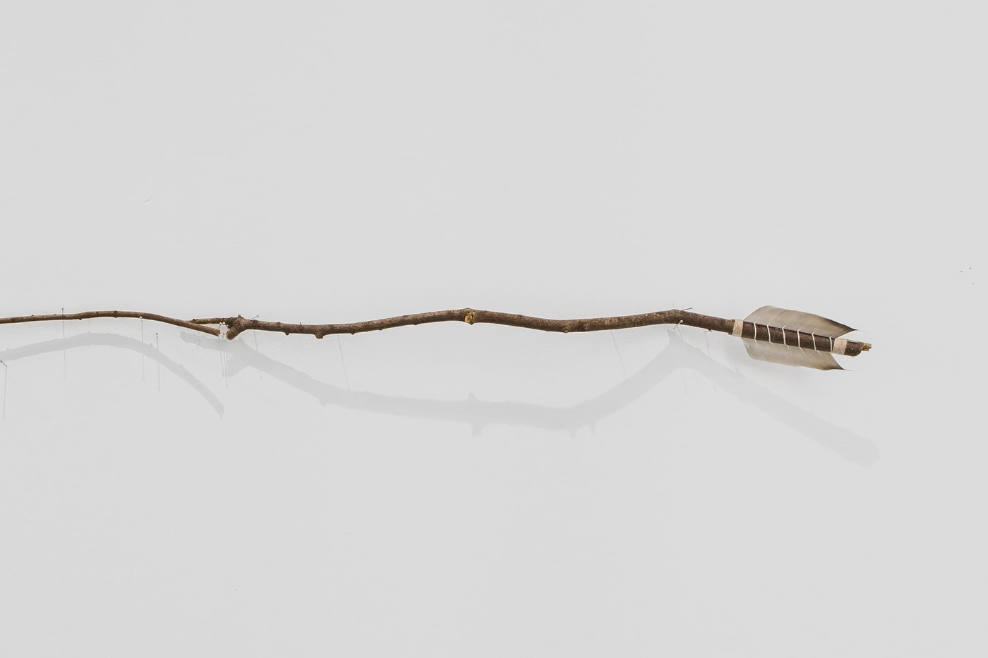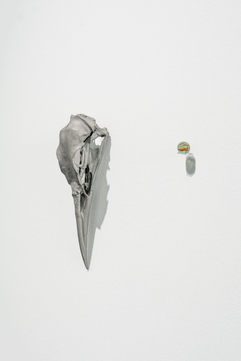 The exhibition integrates these elements by placing the bird’s skull, cast in metal, alongside the glass sphere, allowing them to function both as a memento and as a subtle call for awareness. Similarly, branches from an abandoned bird’s nest are presented, yet rather than forming their typical circular structure, they are aligned into the shape of a long arrow shaft, with feathers at one end and bones forming its tip. As described by Liu Shuai, this arrow traces the trajectory of a bird’s life: breeding, migrating, and falling.