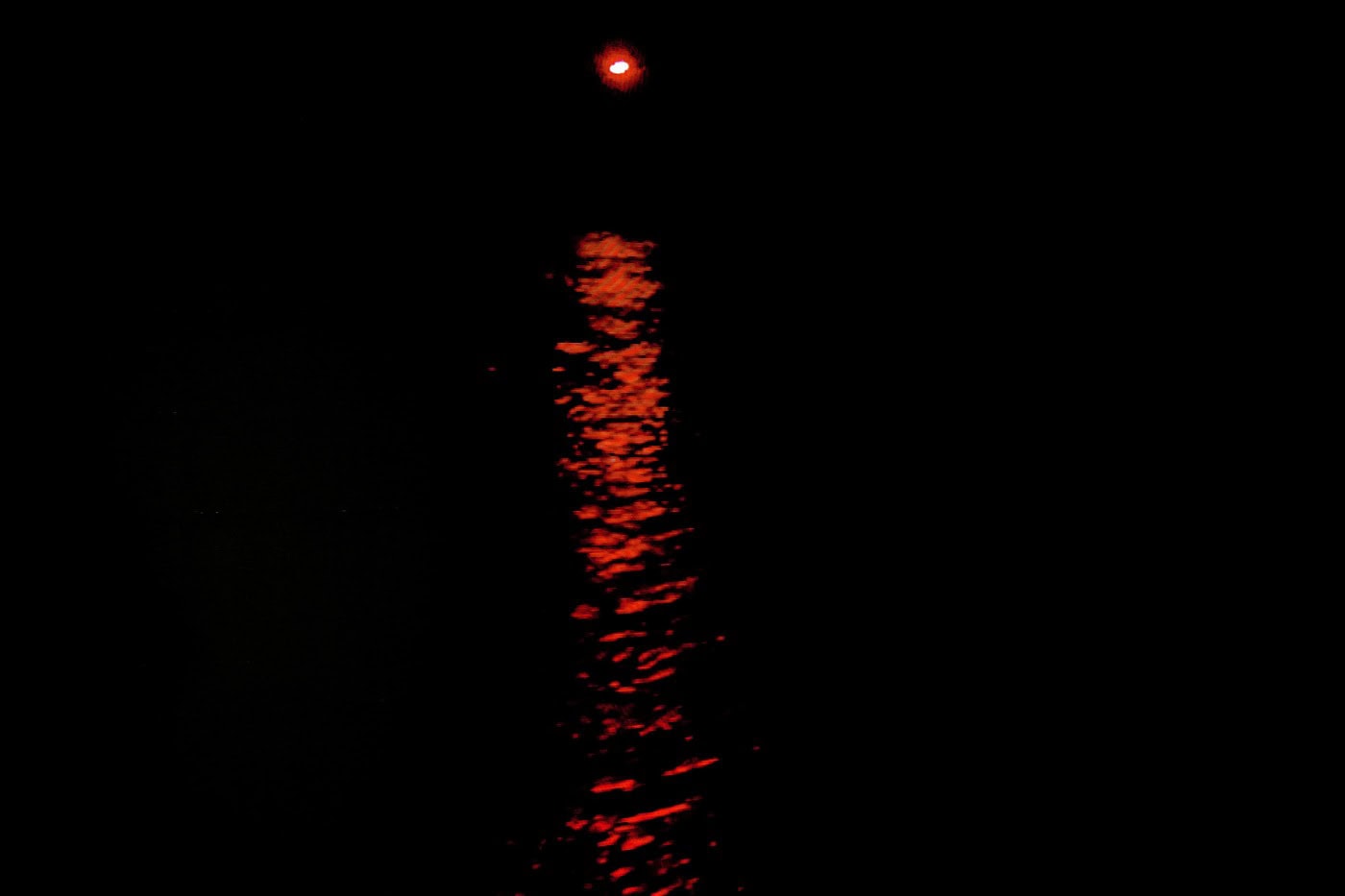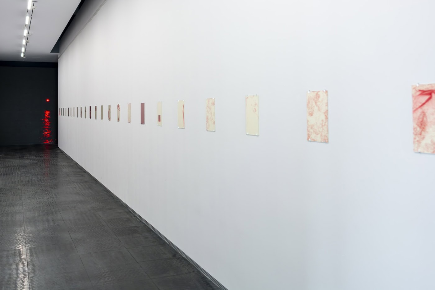 In particular, in this body of work, Fogo (1–37), the artist uses the pigment to create a series of drawings composed of abstract, dynamic lines, opening a reflection on how human patterns of life emerge from the resources communities gather, forage, fish, and hunt. Installed along a corridor, the drawings unfold as traces or resonant waves. They echo the intermittent red light of a distant harbour signal, visible in the accompanying video work further along the wall.