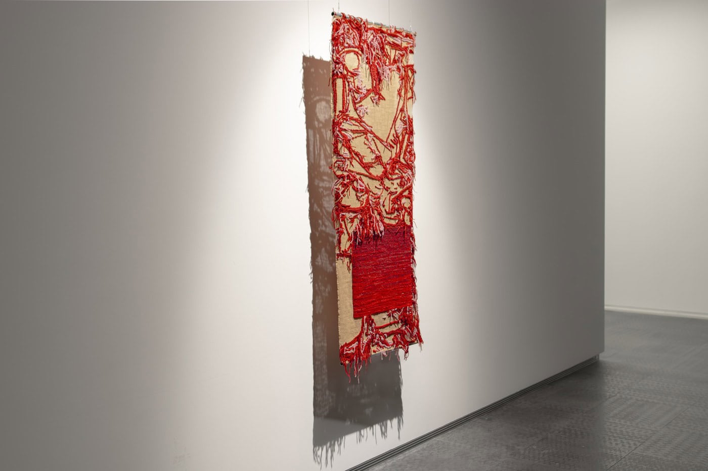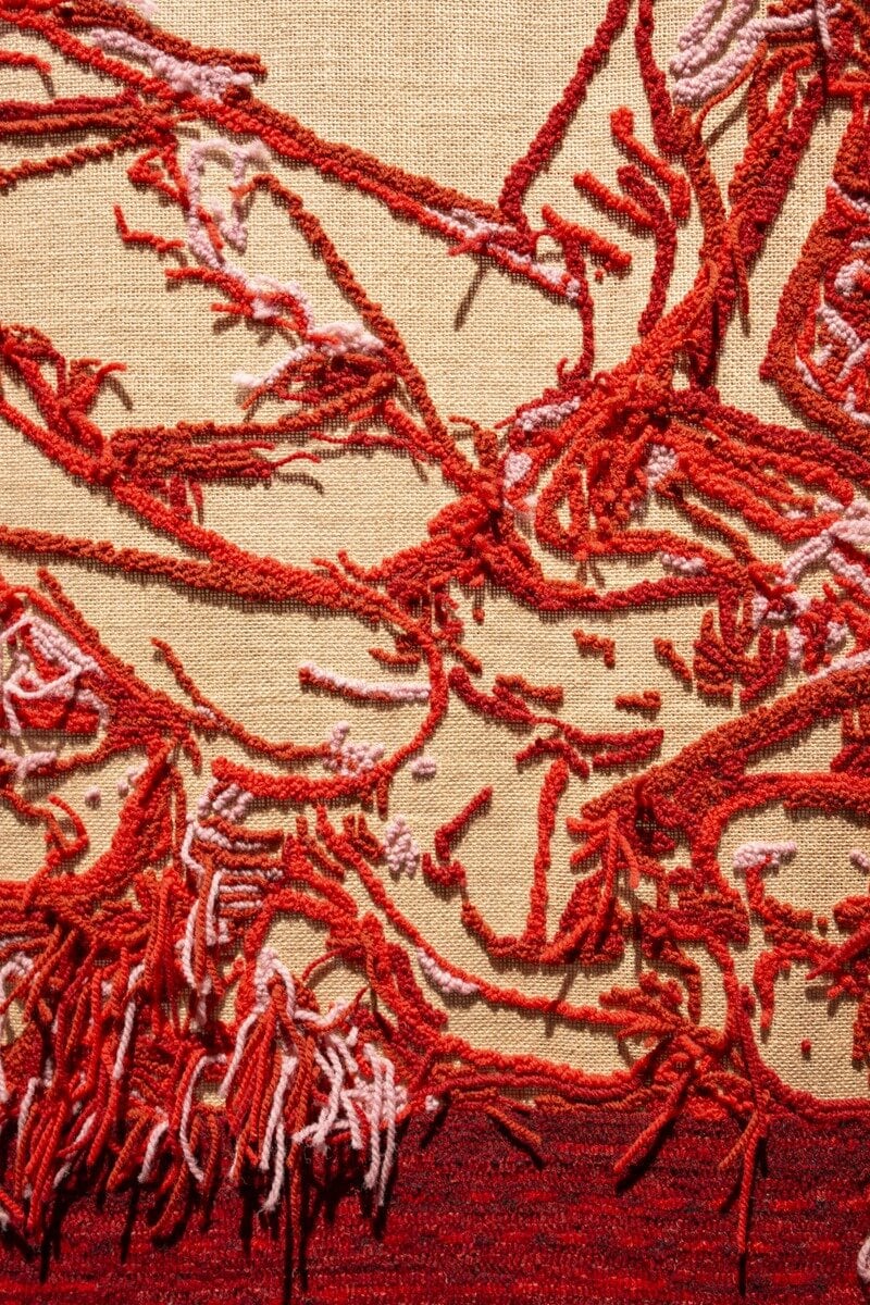 In the textile artwork, Fogo (38),  the colour acquires a more tactile dimension: embroidered yarns on canvas translate the same flowing patterns into a more spatial and material form. Here, red is not merely an aesthetic choice, but a material trace of the territory itself, present in rocks that bleed rust-coloured stains, in maritime signal lights, in the peeling paint of wooden houses, and even in the flush of human skin.