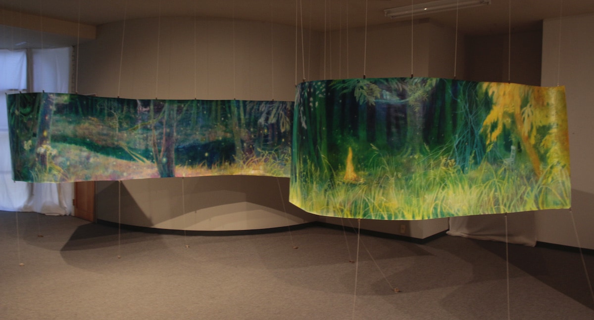 この展示では10mの絵巻を展示する予定ですが、これは心の中に広がる森を鹿野の風景をモチーフに描いたもので、昨年鳥取で発表しました。それからさらに加筆して、絵の裏面に広がる海と夜空を先月滞在制作をしたノルウェーで描きました。個展では表裏合わせて20mの絵を歩きながら鑑賞出来る形になっています。 来てくれた方が自分の心の中を静かに歩くような時間が作れたらと思っています。また、それに合わせて描いた新作の小作品も展示する予定です。
