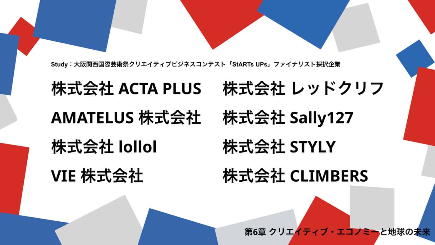 現在開催中の芸術祭「Study:大阪関西国際芸術祭 2025」(10月13日閉幕)での取り組みの一環として、クリエイティブ・エコノミー特化型ビジネスコンテスト「StARTs UPs(スターツアップス)」におけるファイナリスト企業による、ファイナルピッチコンテストが7月23日(水)にグランキューブ大阪で開催されます。本ビジコンはスタートアップ企業(シリーズは問わず)、もしくは企業の新規事業を対象に、アートをはじめとするクリエイティブ・エコノミーの市場拡大と雇用創出を目的としたプロジェクト。今回、国内外から77社を超える応募が寄せられました。NPO青山デザインフォーラムは公式メディアパートナーとしてStudy:大阪関西国際芸術祭 2025をサポートしています。