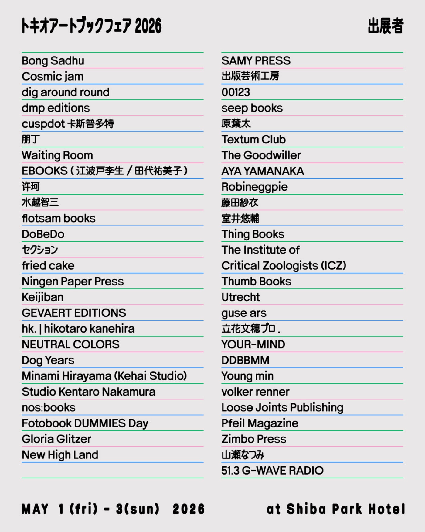 出展者は過去にTOKYO ART BOOK FAIRへ参加経験のある16組がホストとなり、それぞれが2組のゲスト出展者を推薦する構成とする。この仕組みにより、既存のネットワークに加え、個人的な関係性や地域性を起点とした新たなつながりが生まれることを目指している。会場となる芝パークホテルは、1948年に創業した歴史あるホテルである。2020年のリブランド以降、「Library Hotel」をコンセプトに約2,000冊の書籍コレクションを備える。