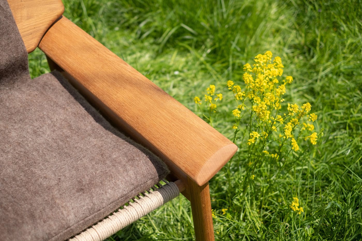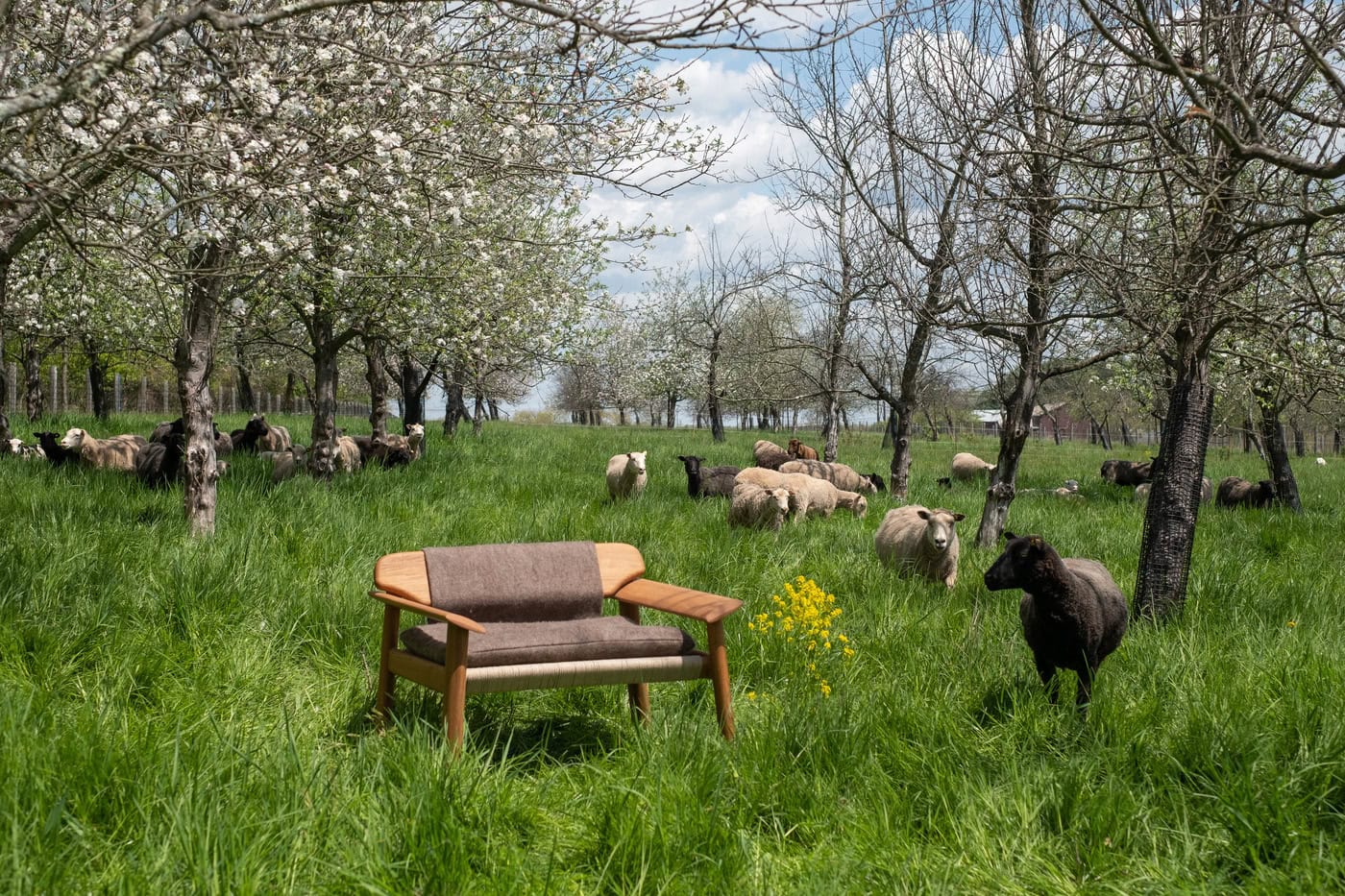 「Terra Lounge」:OkaTerraとMirumの協働によるラウンジチェア。廃ウール、麻、植物性レザーを使用し、構造は倒木材を精密加工。修理可能な構造と高い快適性を両立。