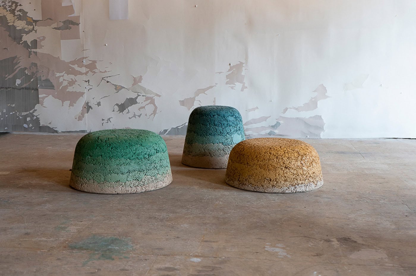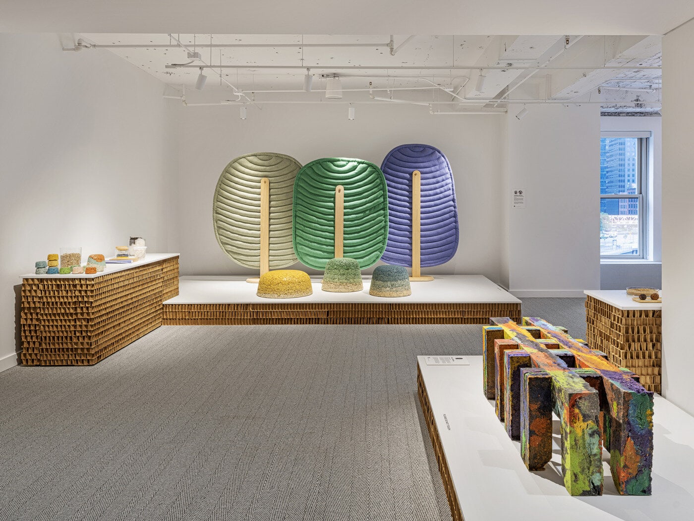 「Haworth Understory」:廃ウール、柳、麻、回収木材などを使った生分解性スツールと間仕切り。ミネラル顔料で自然なグラデーションを演出。