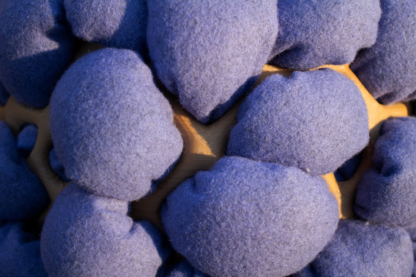 「Nodo Stool」:木粉とトウモロコシ由来の3Dプリント素材を用いた構造体に、Kvadratの廃棄ウールを充填したチューブ状クッションを有機的に編み込む。