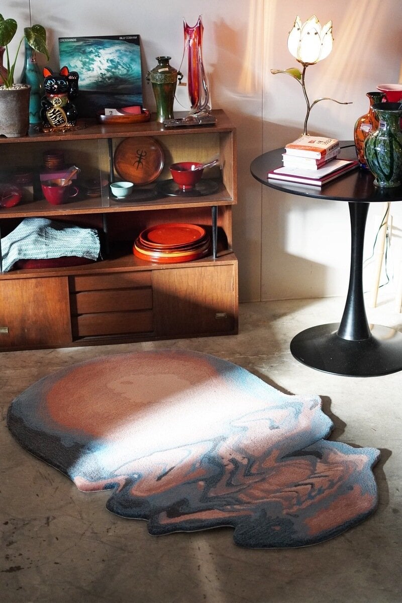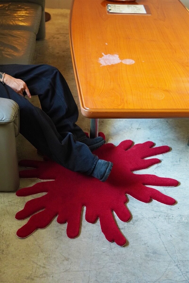 歪んだフォルムは象徴を再構築したデザイン。床に広がるその存在は、まるで現代アート作品のように空間を引き締め、特別な佇まいを与える。