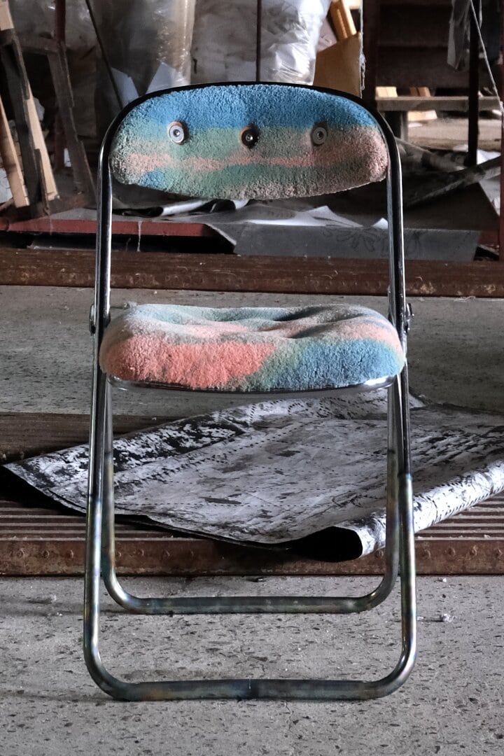 IIISUは碁盤やアクリル、廃棄されてしまう蛇革、スニーカーのソール、役目を終えた服など、様々な素材でパイプイスを張り替えてきた。OZ WORKSはあたたかでふわふわとした印象の一般的なラグとは対照的に、一本一本の糸がみっちりと打ち込まれ、高密度な張りと耐久性を兼ねそろえたものを国内外のアーティストへのオーダーピースとして手がけてきている。