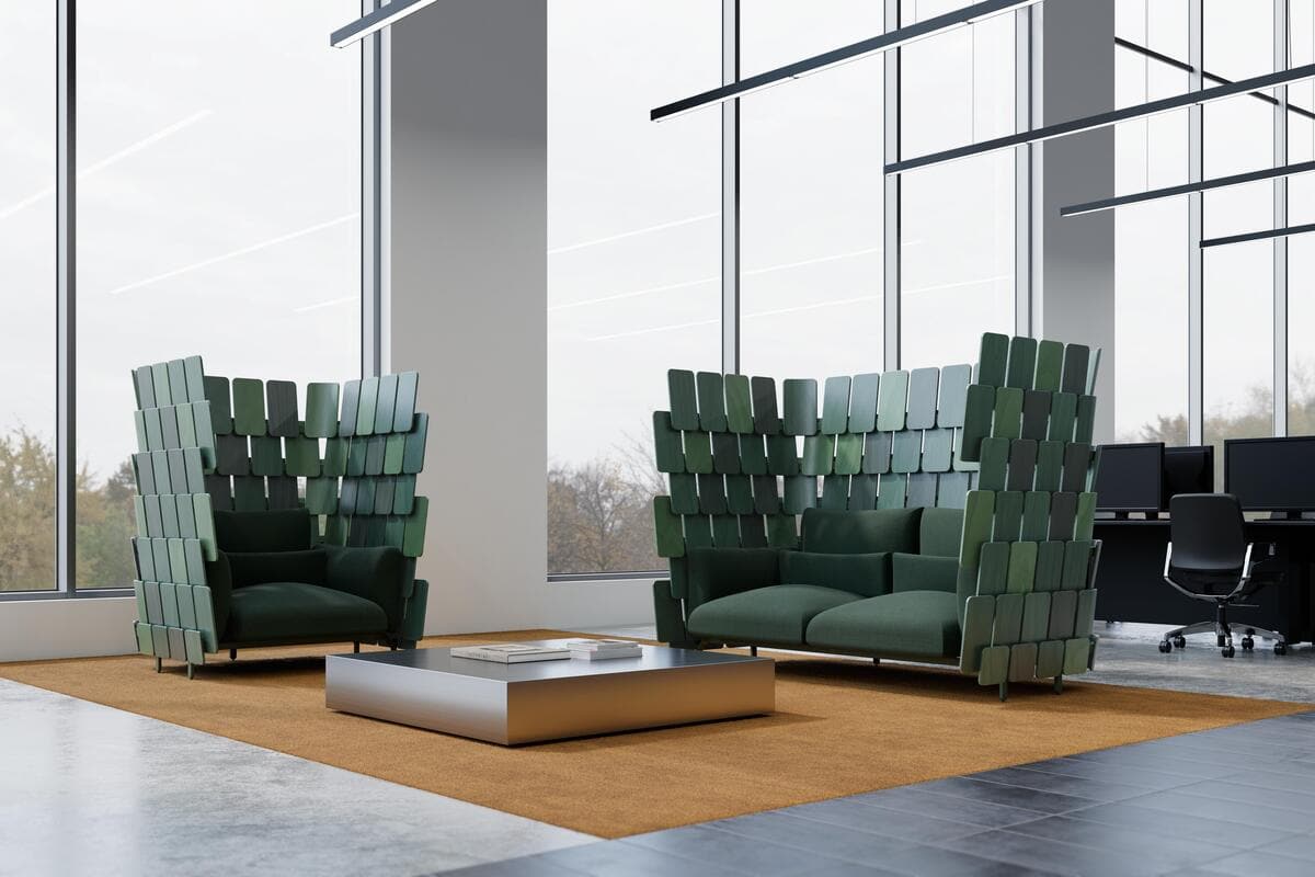 PIGNA articulates space through two elements: a divider and a sofa. The shingle-like panels gently screen the seating area, shielding it from view while still allowing light and air to filter through.
