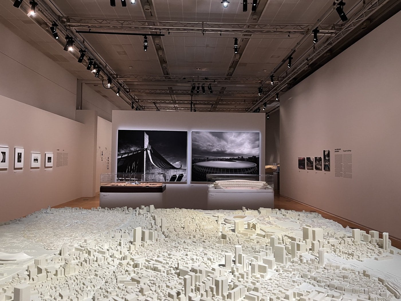 The exhibition's journey through Tange's and Kuma's works reaches its climax in a room that serves as the narrative fulcrum of the entire showcase. Here, visitors can find a large 1/1000 scale model of the Shibuya and Aoyama districts in Tokyo, where Tange's Yoyogi Gymnasium and Kuma's National Stadium are located. These two architectural icons are interpreted through four key words — line, eaves, landscape, and arch — in such a way as to progressively highlight their points of encounter, as well as their points of clash. Therefore, the Yoyogi Gymnasium, designed by Tange for the 1964 Tokyo Olympics to host swimming, diving, and basketball events, presents a fluid volumetry reminiscent of the elegantly curved traditional mukuri roofing, countering the monolithic heaviness of the reinforced concrete used in its construction. This curved space and the projection of its eaves initiate a dialogue between interior and exterior, incorporating both architectural influences, such as the Tōshōdai-ji temple in Nara, and literary ones, as seen in Jun'ichirō Tanizaki's In Praise of Shadows. Kuma's stadium, built for the opening and closing ceremonies of the 2020 Tokyo Olympics, features instead a large volume that doesn’t overshadow the delicacy of its wooden construction. The structure's four progressively projecting, vegetated canopies allow finally the imposing design to gently fit in the surrounding urban landscape. Several black-and-white photographs by Yasuhiro Ishimoto (documenting Yoyogi during and after its construction in 1964) and Mikiya Takimoto (capturing the National Stadium in May 2023) finally represent the rich spatiality of these two projects on a flat, two-dimensional plane, allowing visitors to examine how these architectural works engage with the exhibition's guiding concepts.
