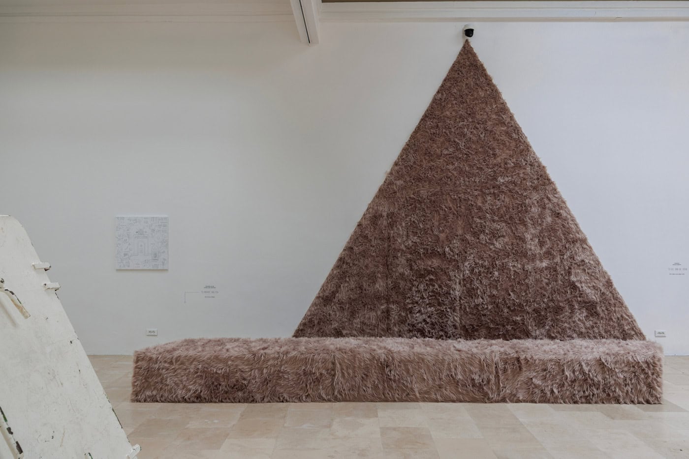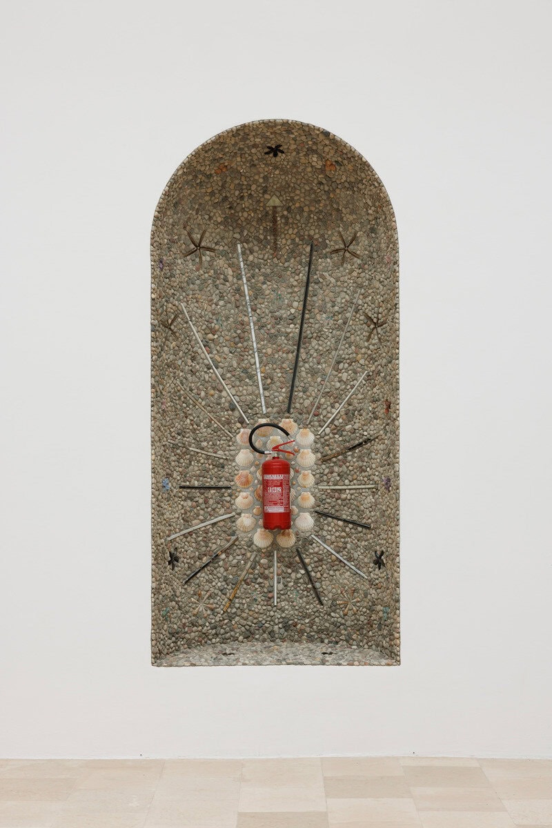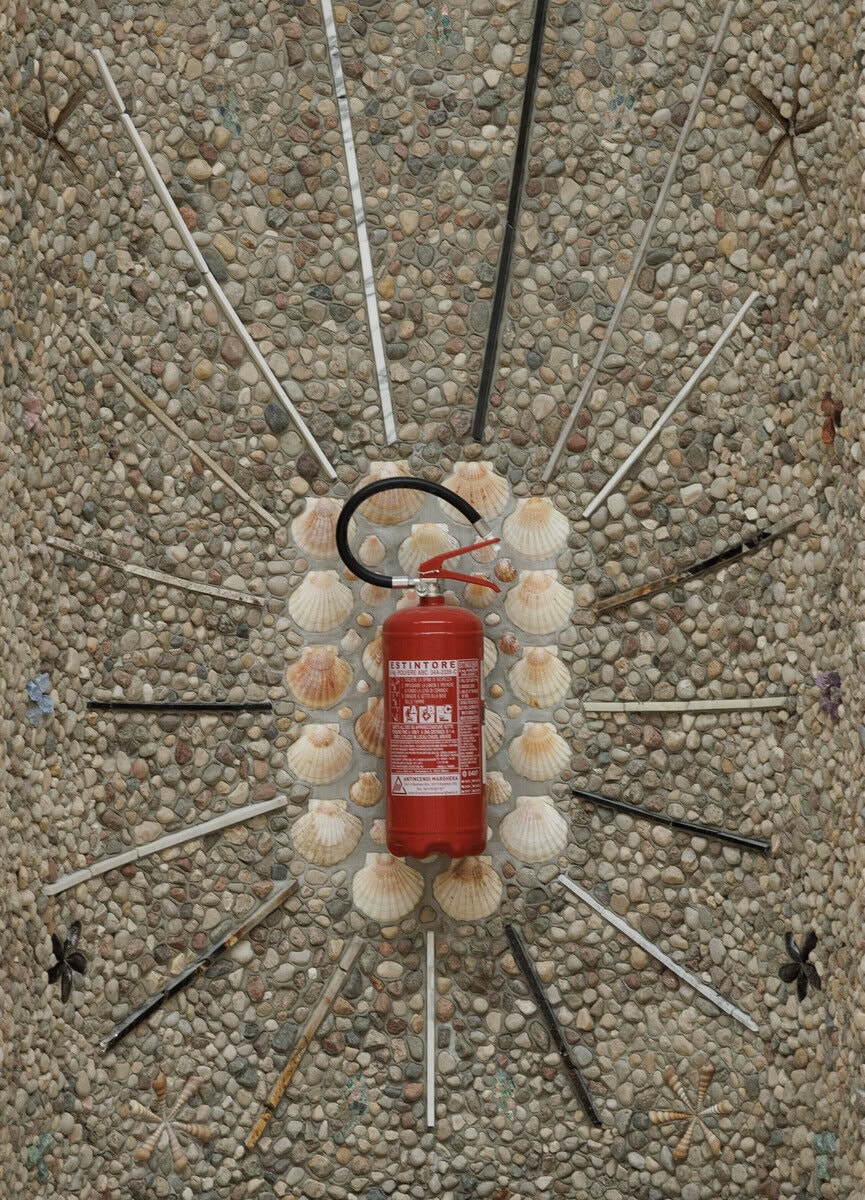 With a humanistic gaze, the exhibition constantly weaves together the regulatory and emotional layers of architecture—two domains often perceived as separate. Thus, a fire extinguisher—quintessentially utilitarian—is set into a niche decorated like a fresco, or framed in a Venetian-style mosaic, revealing its symbolic and reassuring qualities.
