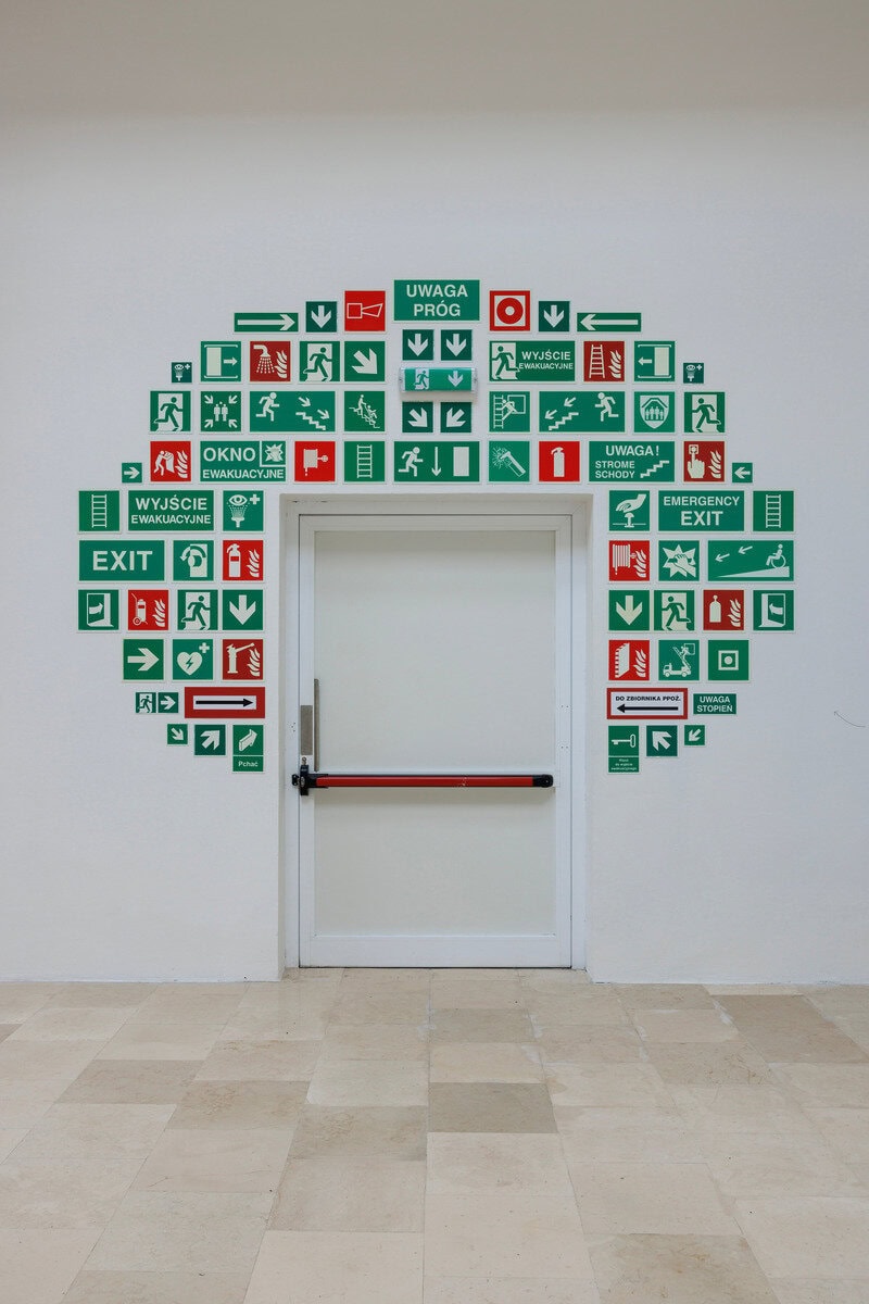 Existing emergency infrastructure—such as evacuation signs and fire alarms—is highlighted within the exhibition to reflect how safety regulations shape architectural space