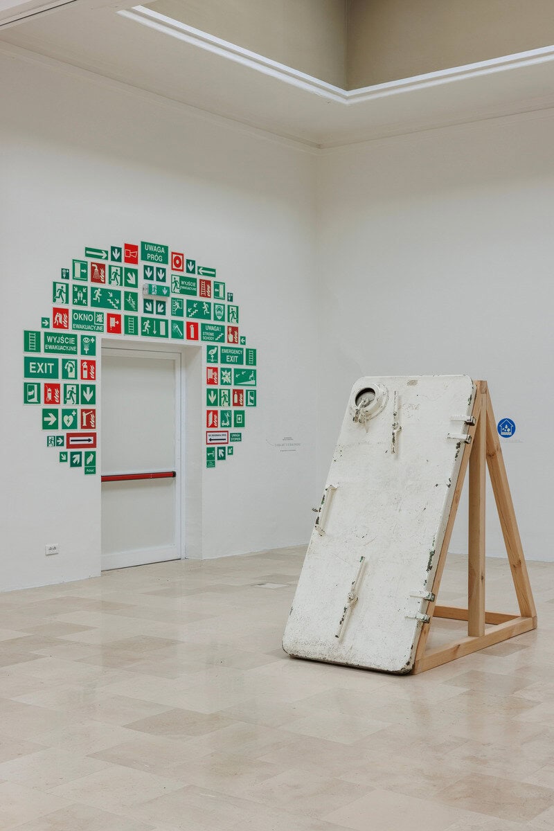 - Hermetically sealed armoured door, a standard element of underground shelters built to withstand shock waves and, in the case of nuclear shelters, to block radiation. Like all objects in the exhibition, it was selected by the curators as part of a dedicated research process—from real, existing pieces sourced and assembled specifically for this project Photo credit: Jacopo Salvi, Zachęta archive