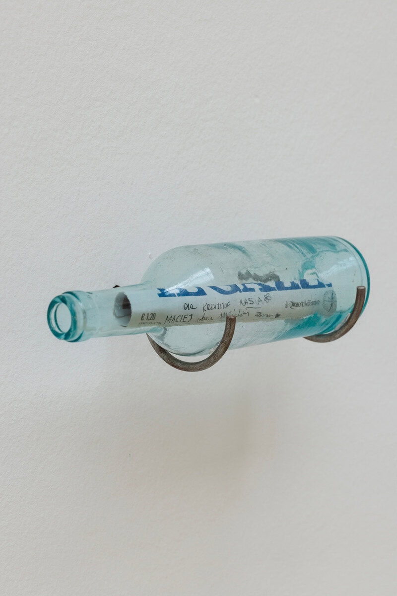 A bottle sealed into the wall, containing workers’ signatures and a newspaper—part of a long-standing tradition of leaving a trace inside the building for posterity, a practice still observed today