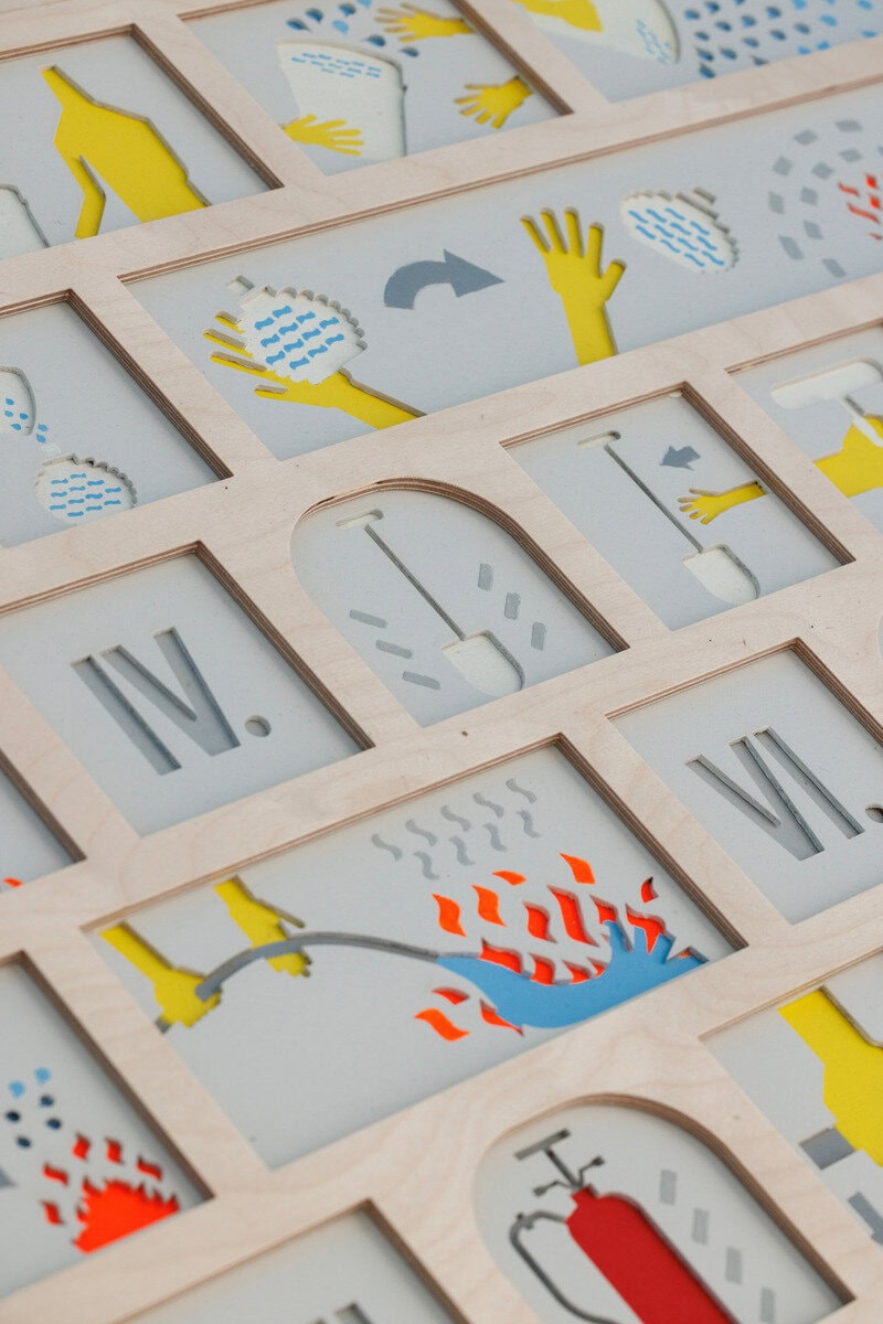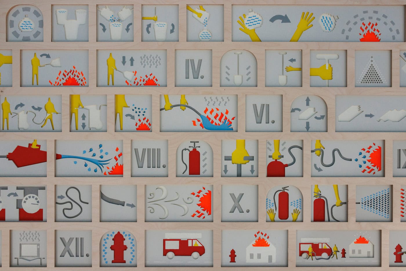 Instructional graphics by Maciej Siuda illustrating how to use a fire extinguisher—functional drawings integrated into the installation as part of a reflection on safety and everyday ritual