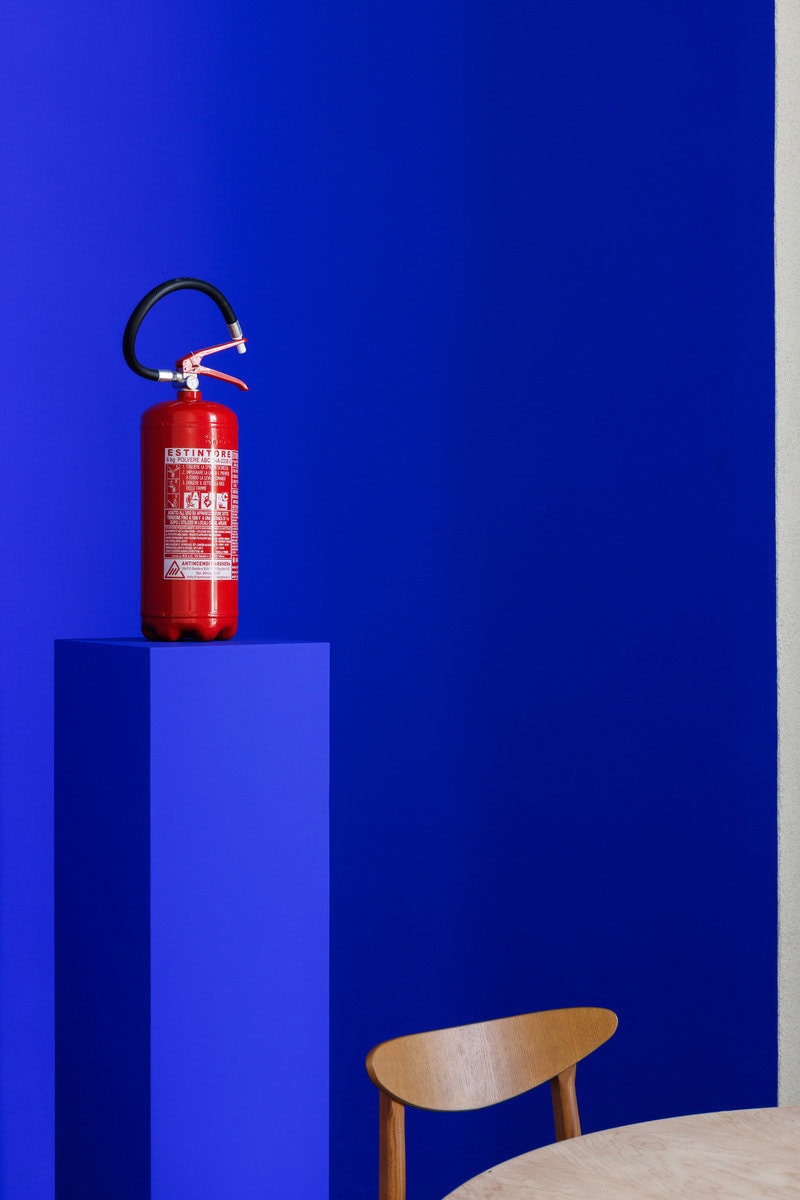 A hand fire extinguisher, part of a long history of firefighting tools—from bucket brigades to chemical cartridges—now reframed as both a safety device and a design element