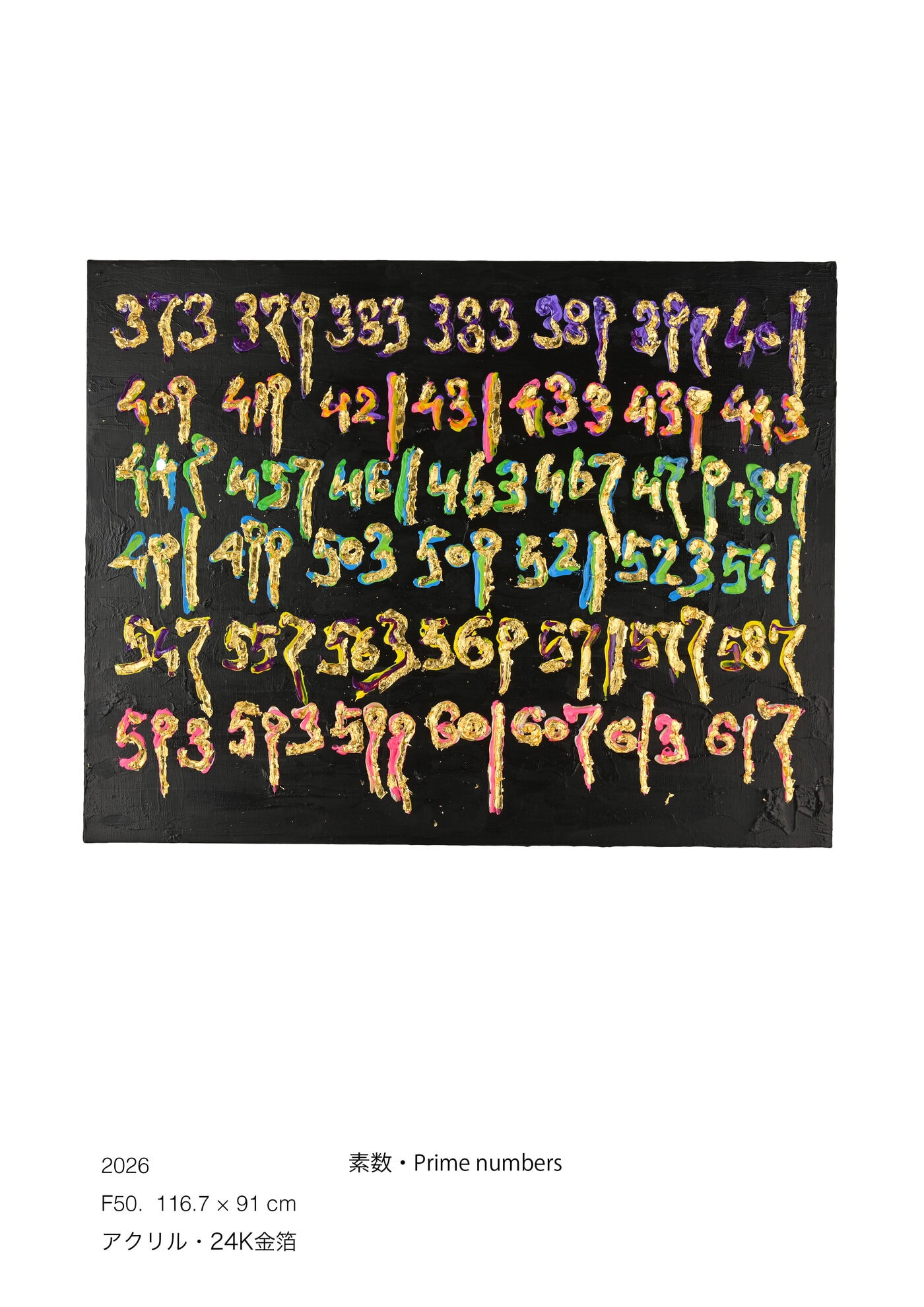 そこでは宇宙論やエネルギー、精神性といった根源的なテーマが一貫して探求されている。具体美術協会における西洋美術と東洋的思想の接続、さらにアンフォルメルやポストミニマリズムとの共鳴など、その実践は戦後美術史の流れと密接に関係している。本展では、初期の実験的な試みから現在に至るまでの作品群を通して、森内敬子の持続的な探求とその連続性を提示する。80代を迎えた現在もなお衰えない創作意欲によって生み出される作品群は、時間を超えた思考の積層として鑑賞者に新たな視点をもたらす。