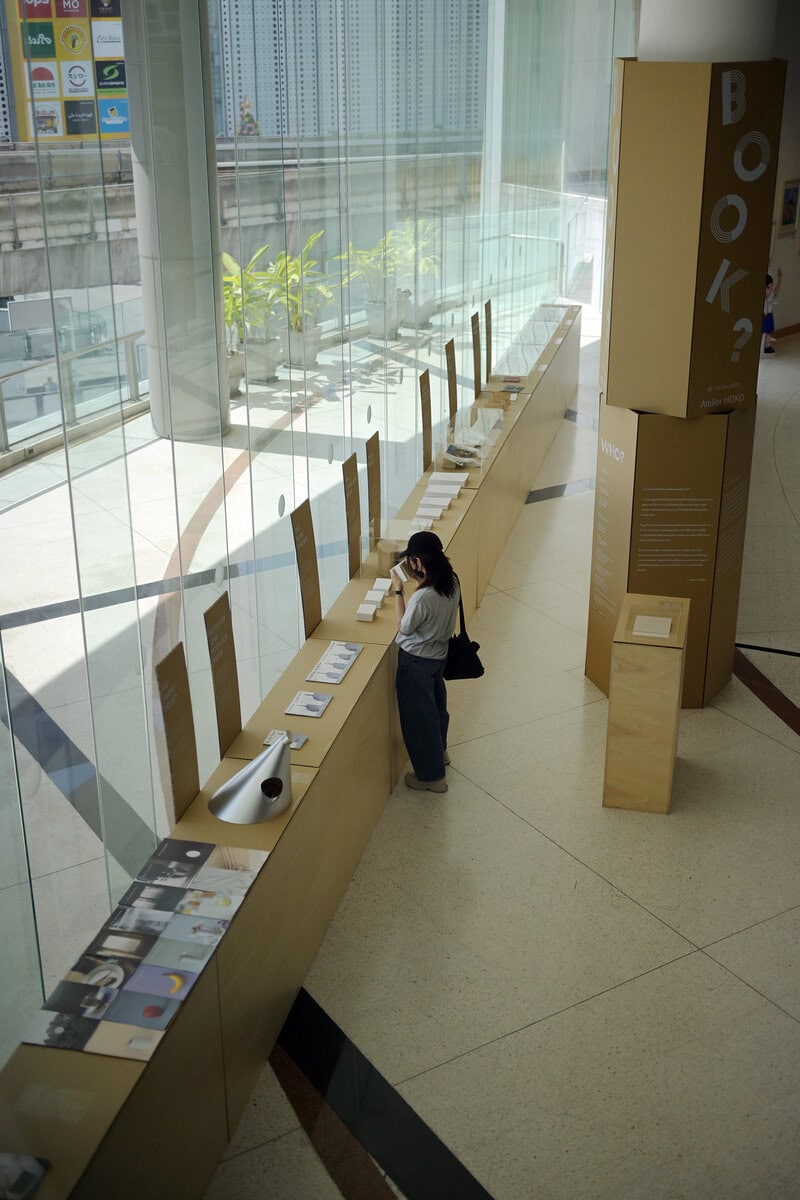 シンガポールで2002年に設立されたインディペンデントのリサーチユニット・Atelier HOKOによる展示。デジタルメディアが広がる現在において本を読む行為にまつわる人間のふるまいや感覚について、様々な「問い」を投げかける。本展は、SINGAPORE DESIGN WEEK 2024で開催された展示「BOOK?」の巡回展。