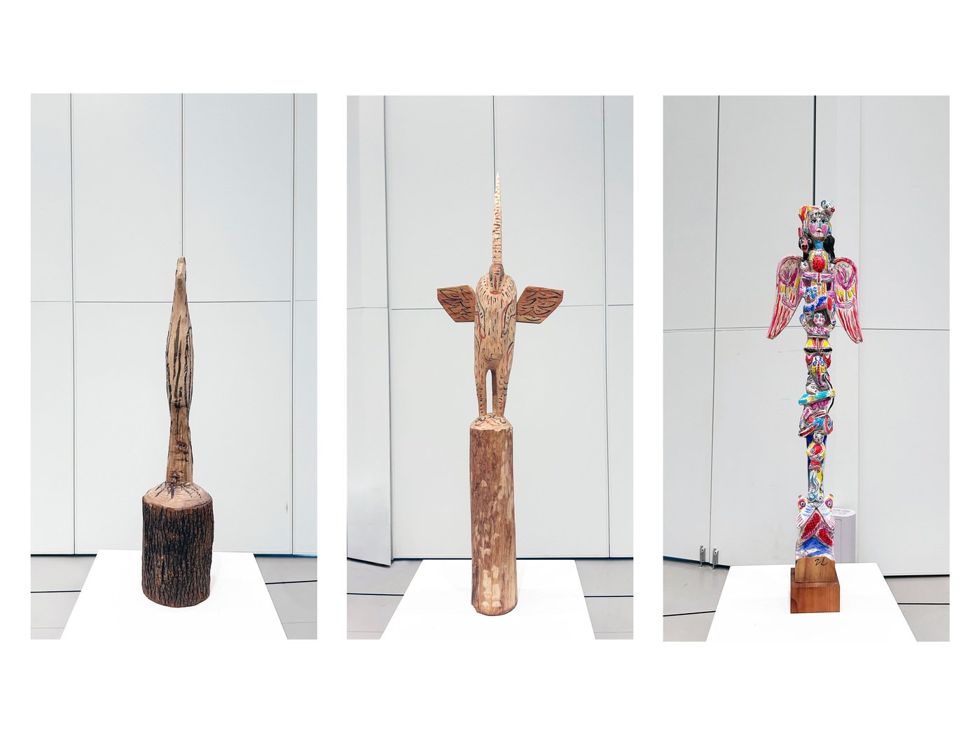 11. Zhou Lei, Birds, 2016, Wood, Ink, 17cm×16cm×80cm. Zhou Lei, Unicorn, 2016, Wood. Ink, 25cm×25cm×75cm. Zhou Lei, The Twelve Constellations, 2021, Wood, Ink, 26cmX8cmX100cm.