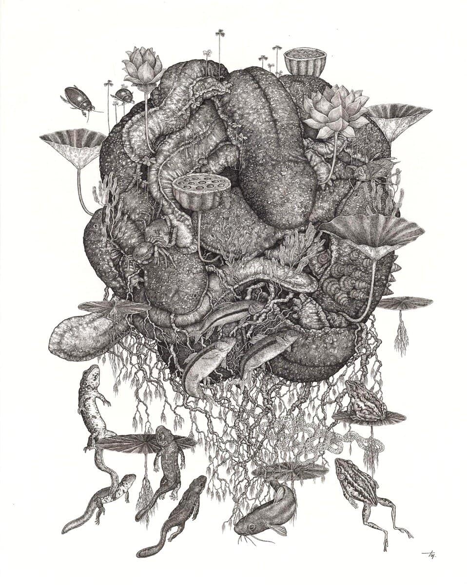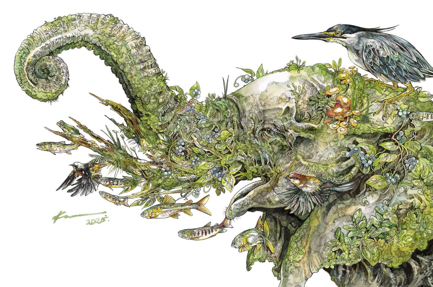 本展ではアーティストたちの創作における内面の揺らぎ、技術的な試み、文化的視点などの「動き」をそれぞれの表現手法や支持体に「収める」という行為に着目し、「動き」がフレームの中で可視化された作品約130点が紹介される。人物や動物などをグラフィカルに描いた作品に加え、緻密な描写や抽象的な表現まで、個性豊かなアートを楽しめる。