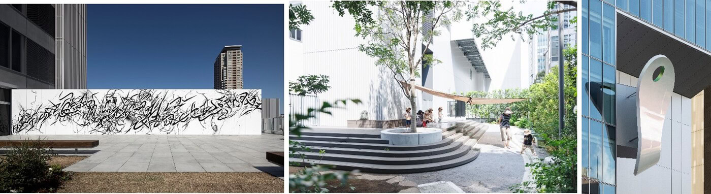 左:ポーラ青山ビルディング・14F屋上テラス/作品:大山エンリコイサム 《FFIGURATI #630》 2024年 Artwork©Enrico Isamu Oyama EIOS, 中央:まちの保育園 南青山 写真:大畑陽子, 右:ポーラ青山ビルディング・外観/作品:SHIMURA bros 《悠久の光景》 2024年 ©SHIMURA bros /Photo©Tatsuya Noaki(左・右)