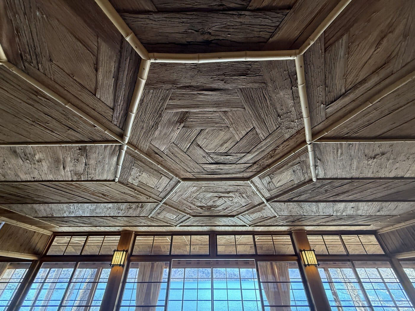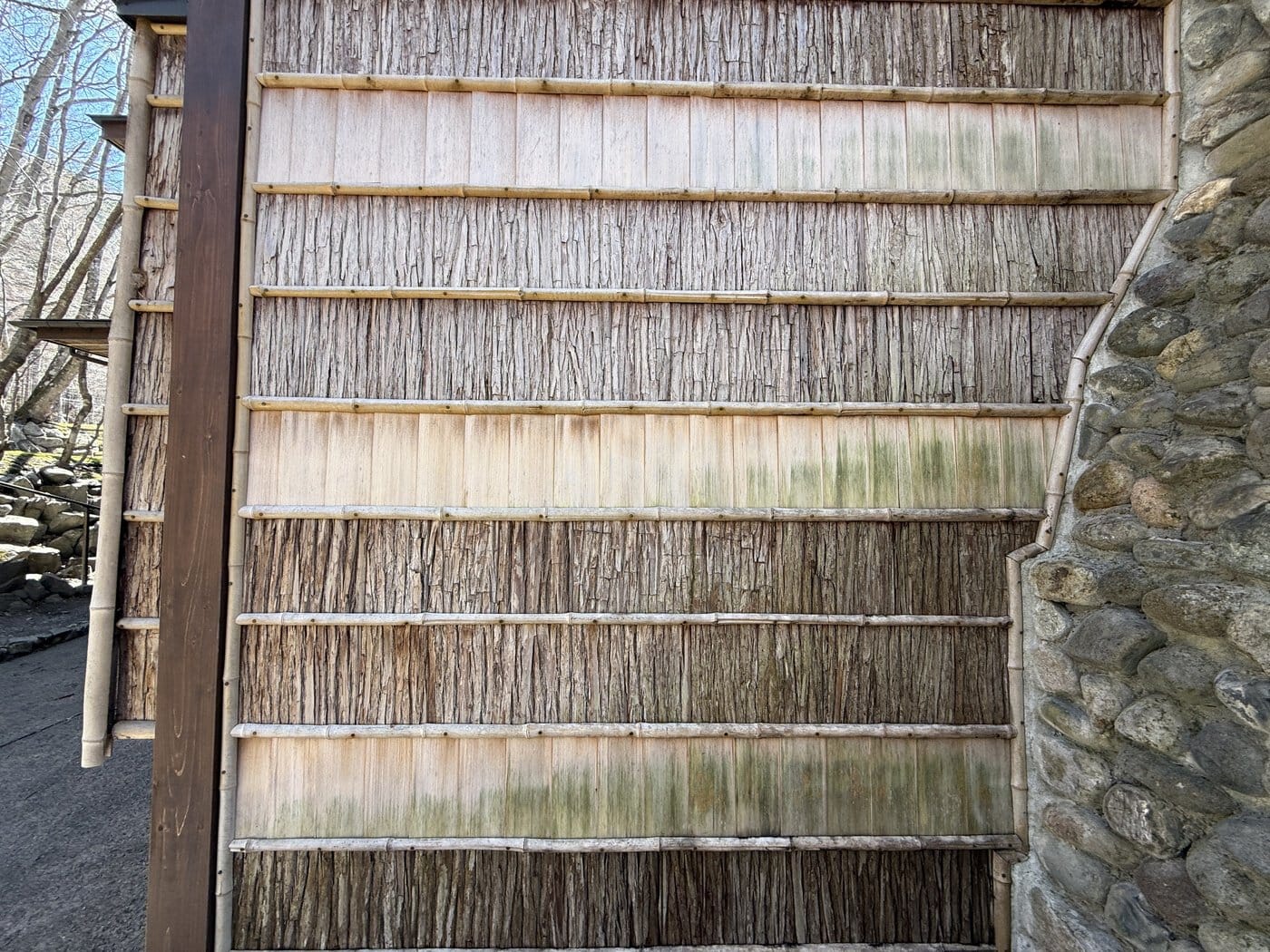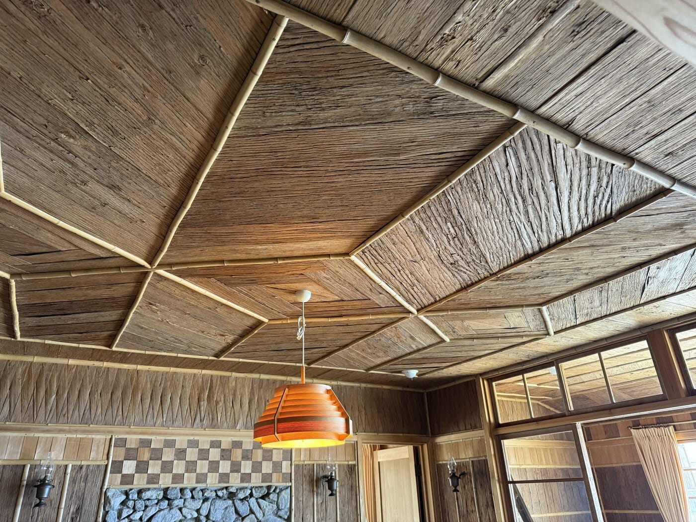 The exterior walls are clad in cedar bark and thin boards arranged in a checkerboard pattern, a motif that reads as simultaneously modern and vernacular — a geometric abstraction born of natural material. Inside, the ground-floor ceiling is entirely composed of cedar bark worked in ajiro, a traditional wickerwork technique associated with the sukiya style of Japanese architecture. The patterns shift from room to room: ichimatsu (checkerboard), kikko (tortoiseshell), yabane (herringbone) — each space defined not by partition walls but by the rhythm of the ceiling above. Split bamboo strips hold the bark panels together, giving the overhead surface a textile quality, as though the building were upholstered rather than constructed.