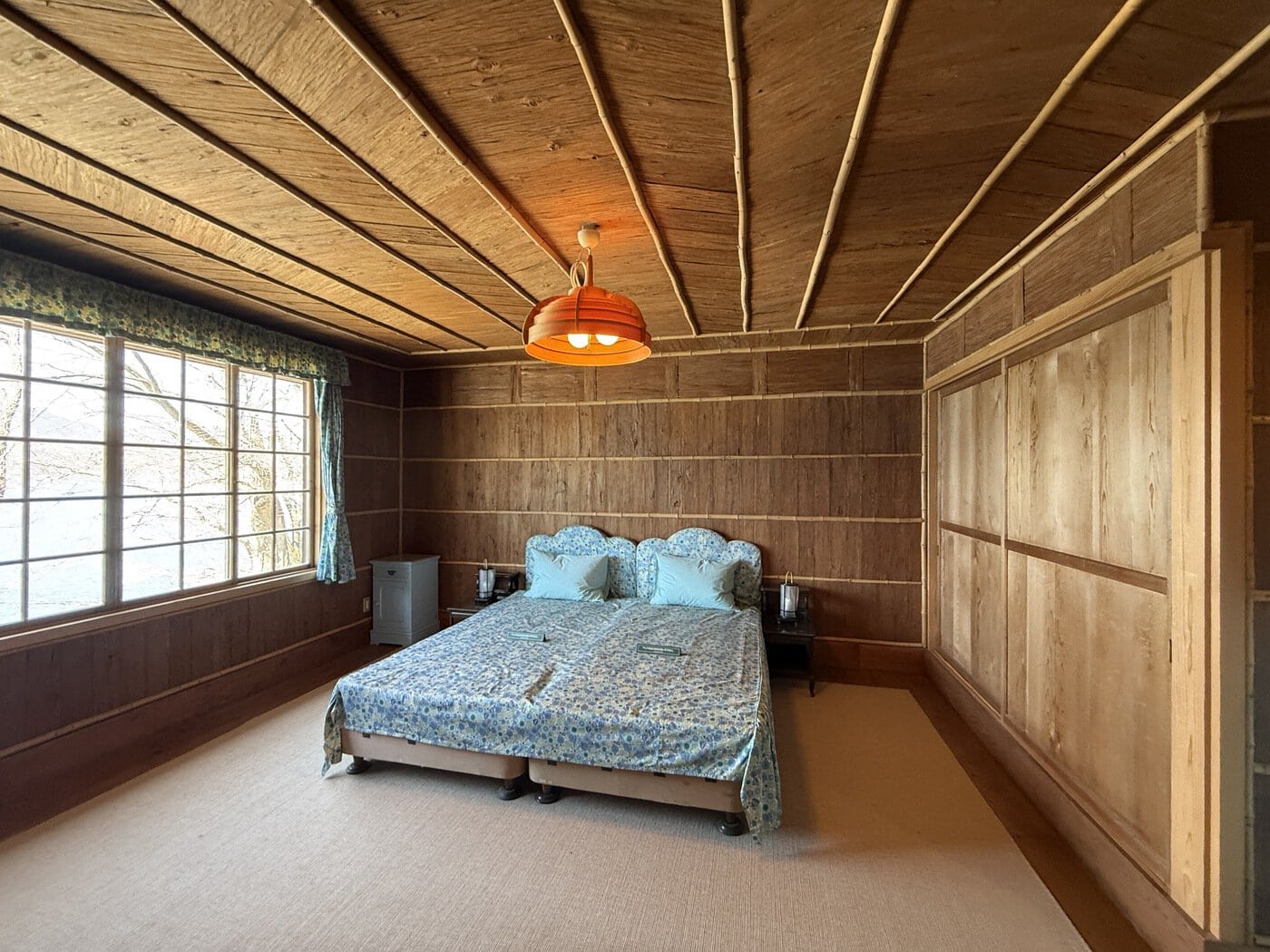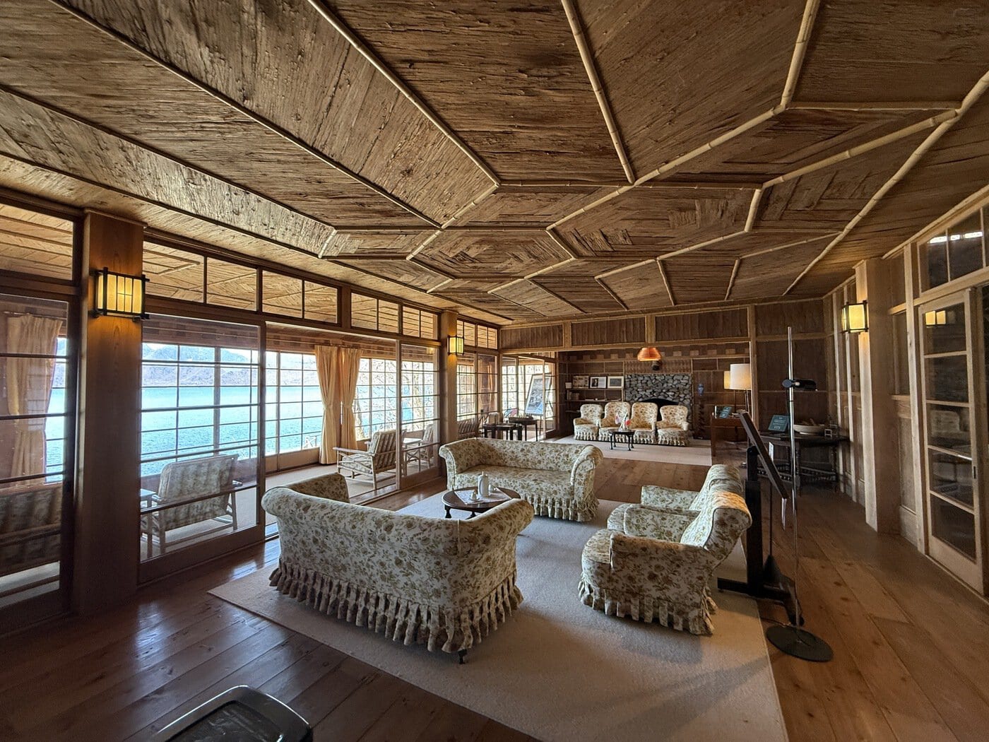 The ground floor unfolds as a sequence of interconnected spaces — living room, dining room, study — flowing toward a broad veranda that opens onto the lake. This veranda, the emotional centre of the house, frames Lake Chuzenji and the forested hills beyond in a composition so deliberate it recalls the borrowed-landscape principle of Japanese garden design, shakkei. One does not merely sit in this room; one inhabits a view. Noémi Raymond, whose contributions are often underestimated, designed the furnishings and lighting fixtures — as she did for most of her husband’s projects — creating an interior atmosphere that is warm, precise, and unadorned.